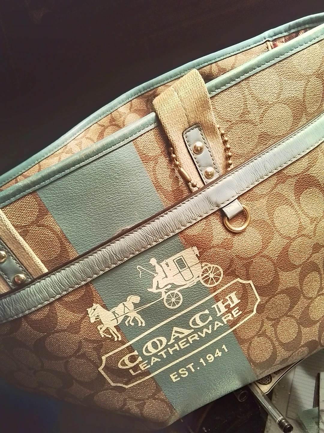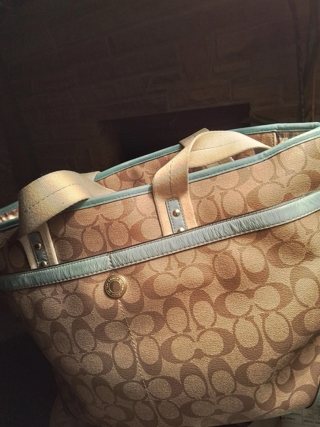 This Coach tote bag features the classic Coach C pattern. It has light blue accents and leather trim. It's a stylish Baby diaper bag. Includes change pad that matches the lining.Lots of room for everything your little one needs on the go.
