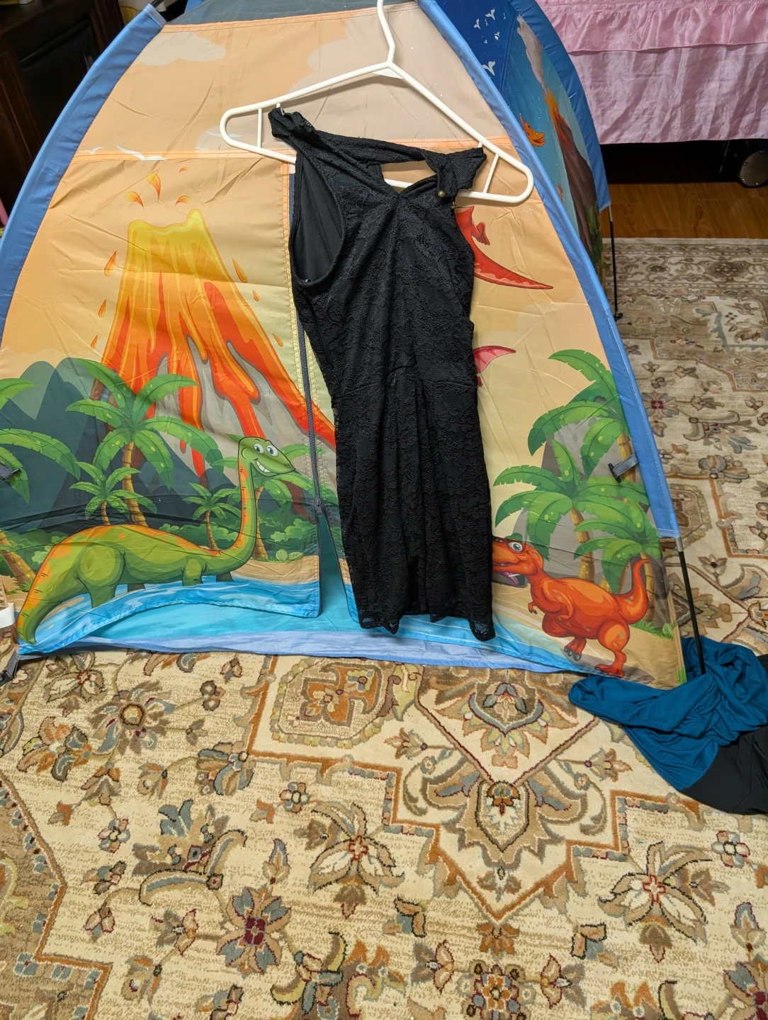 This listing includes two women's tops. One is a black lace sleeveless top. The other is a light purple lace blouse with ruffled details and buttons down the front. Both tops are made of lace material.