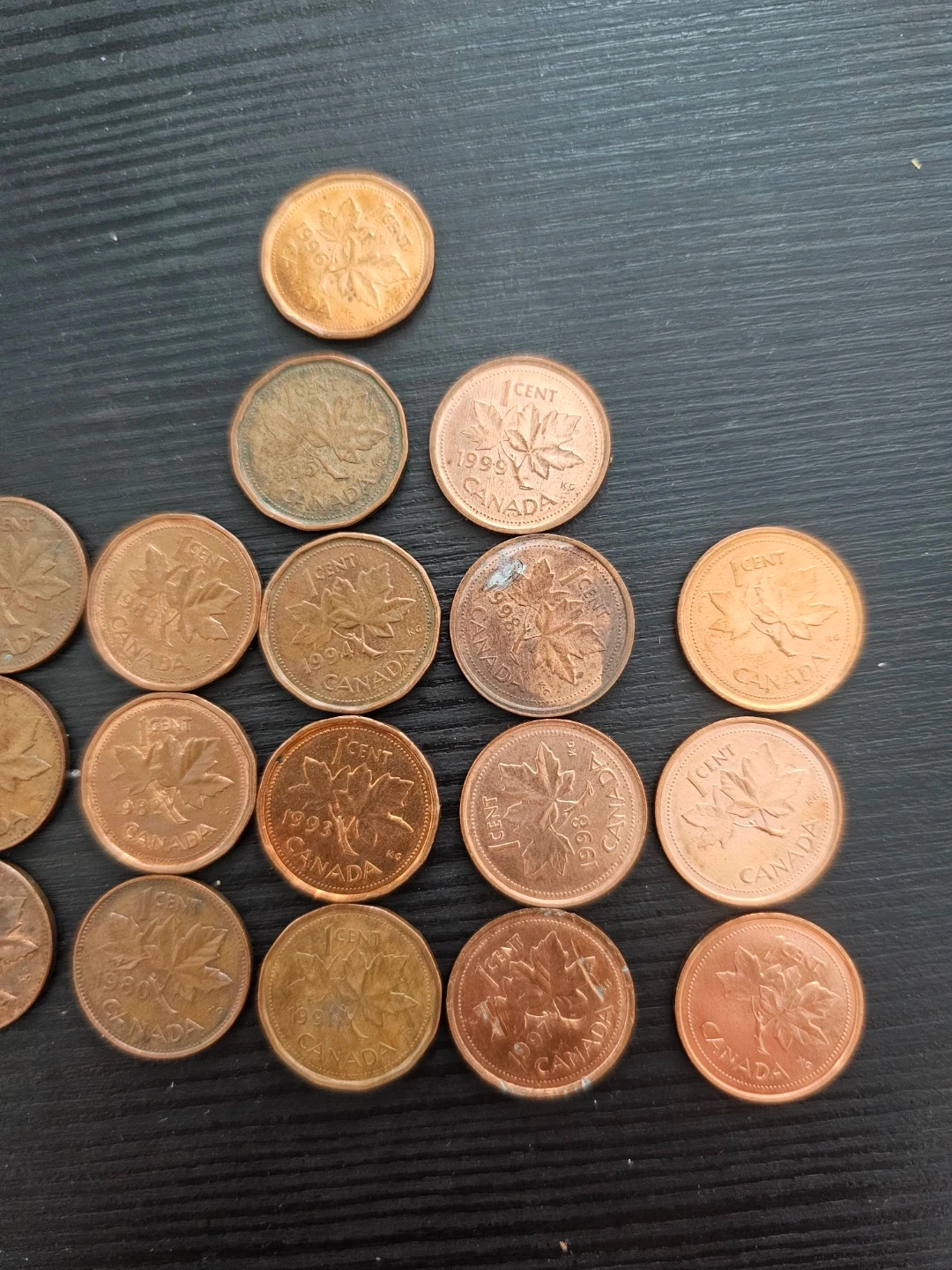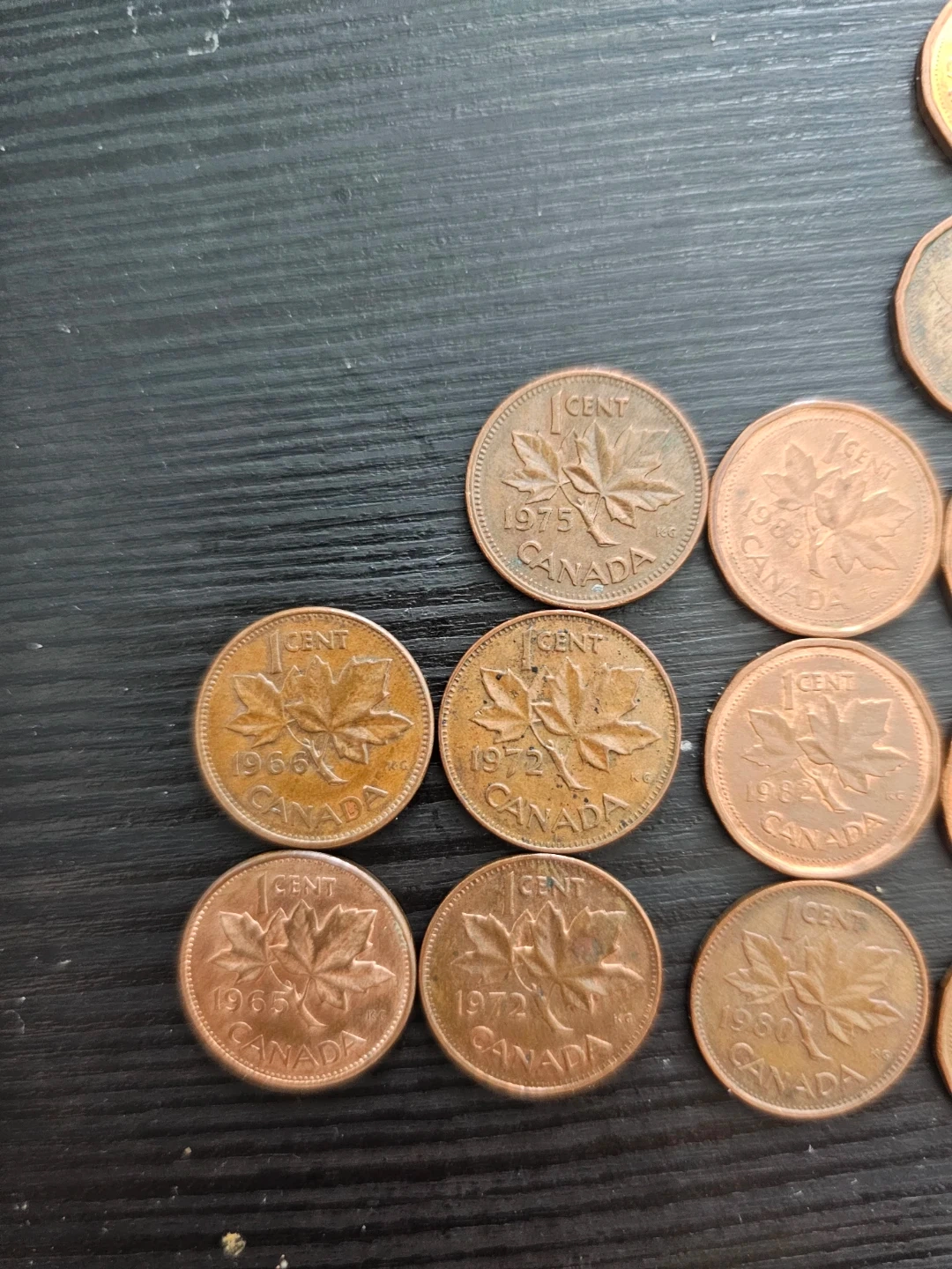 A collection of Canadian one cent coins featuring maple leaves. Various years are present, including 1965, 1972, 1975, 1982, 1983, 1993, 1994, 1995, and 1996. These coins are made of copper.