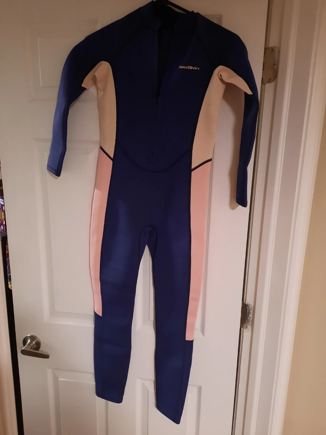 This is a SeaSkin full body wetsuit. It's a size 12 with a zipper front closure. It's made of neoprene material and is great for water sports! Size. 12.