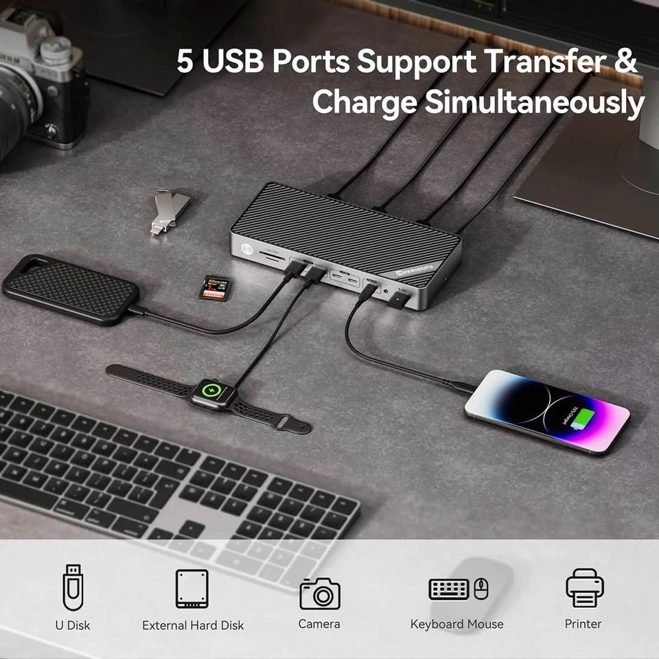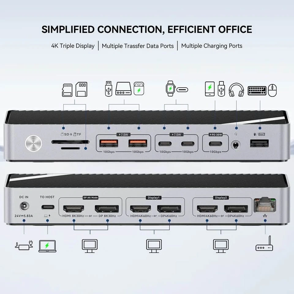 Great docking station for a powerful, clean multi-monitor setup. Supports up to 3 monitors (HDMI + DisplayPort, up to 4K/8K). Works with Mac M1/M2/M3 and Windows using DisplayLink. 140W power adapter included (up to 85W charging for your laptop). 16 ports total: USB-C (10Gbps + 30W charging), multiple USB-A, Ethernet, SD/TF, audio. Fast data transfer + charge your phone/tablet at the same time. Perfect for productivity, coding, or research setups—just plug in one cable and you’re good to go. Everything included and working great.