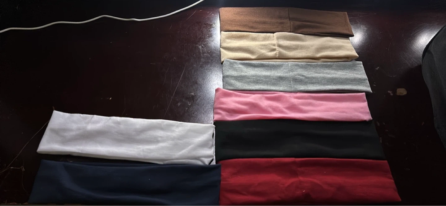 Eight soft fabric headbands in various colours. Includes navy, white, brown, beige, grey, pink, black, and red. Stretchy material for a comfortable fit.