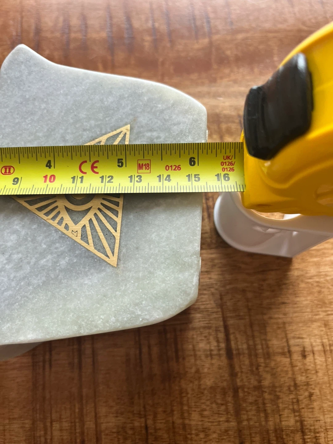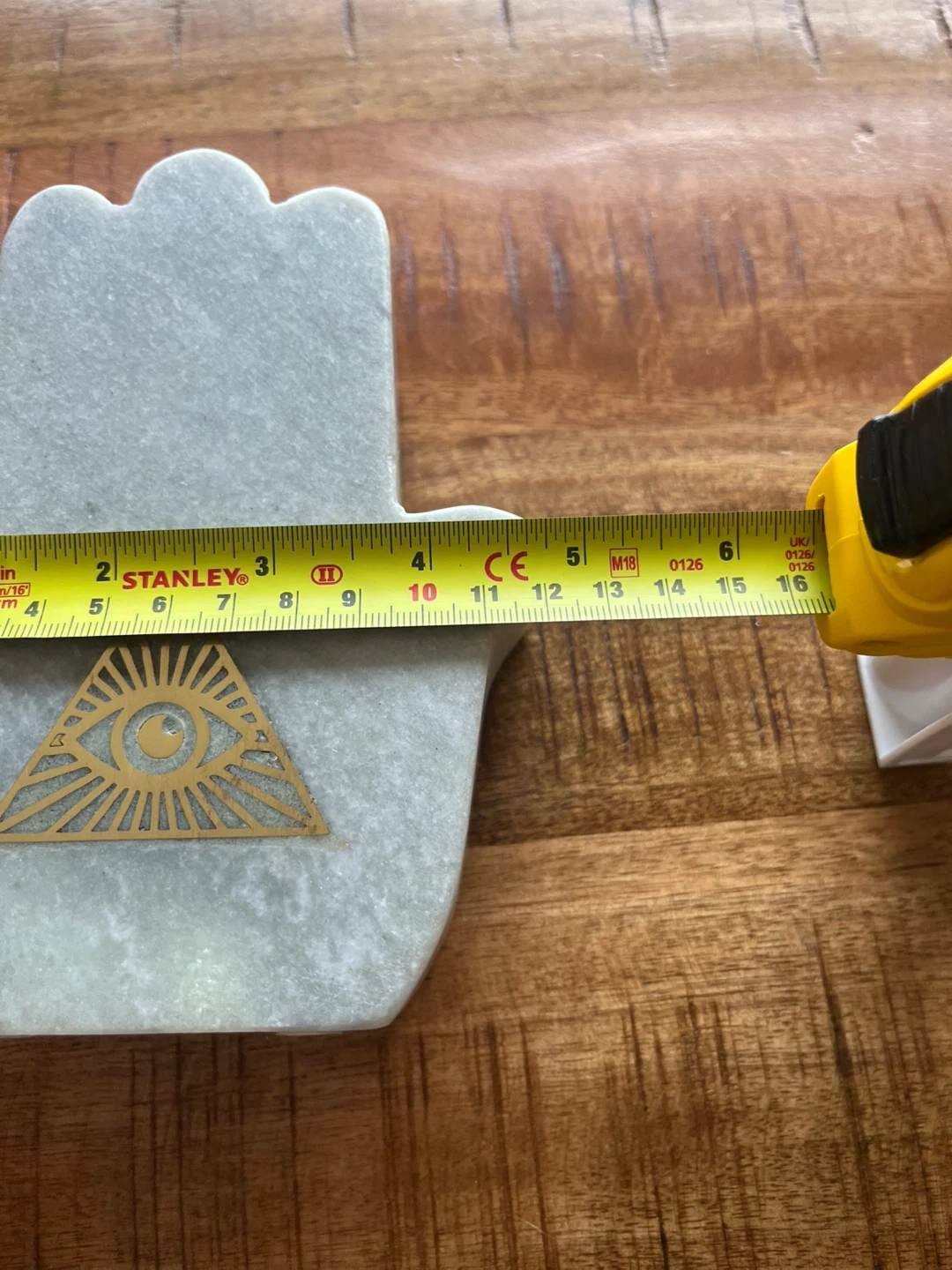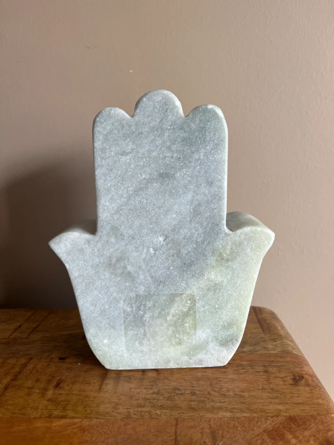 Decorative Hamsa hand made from marble. Features a gold-tone Eye of Providence design. Made in India. It's a unique piece for home decor.