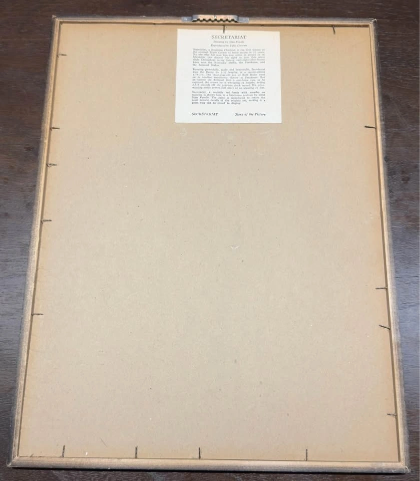 Secretariat, was a majestic red brute with muscles on muscles, and is shown here in a handsome portrait by artist Stan Fenelle. The print is reproduced to retain the most minute details of the original art, making it a print one can be proud to display.
