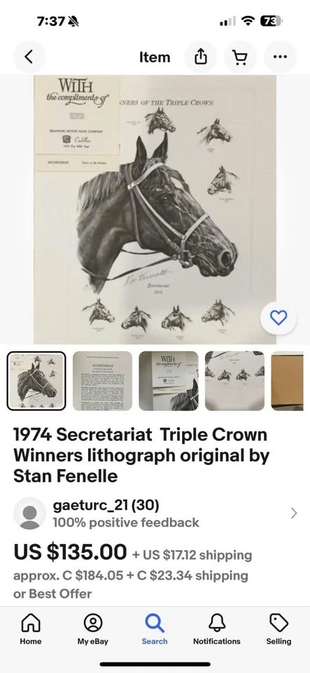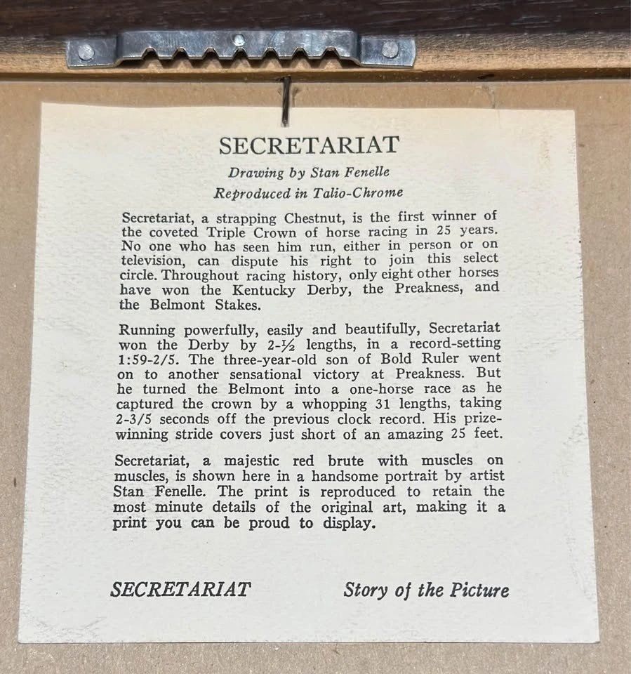 This artwork features artist ‘Stan Fenelle’ drawing of Secretariat and the only other eight (8) horses to ever win the Kentucky Derby, The Preakness, and the Belmont Stakes (Triple Crown).