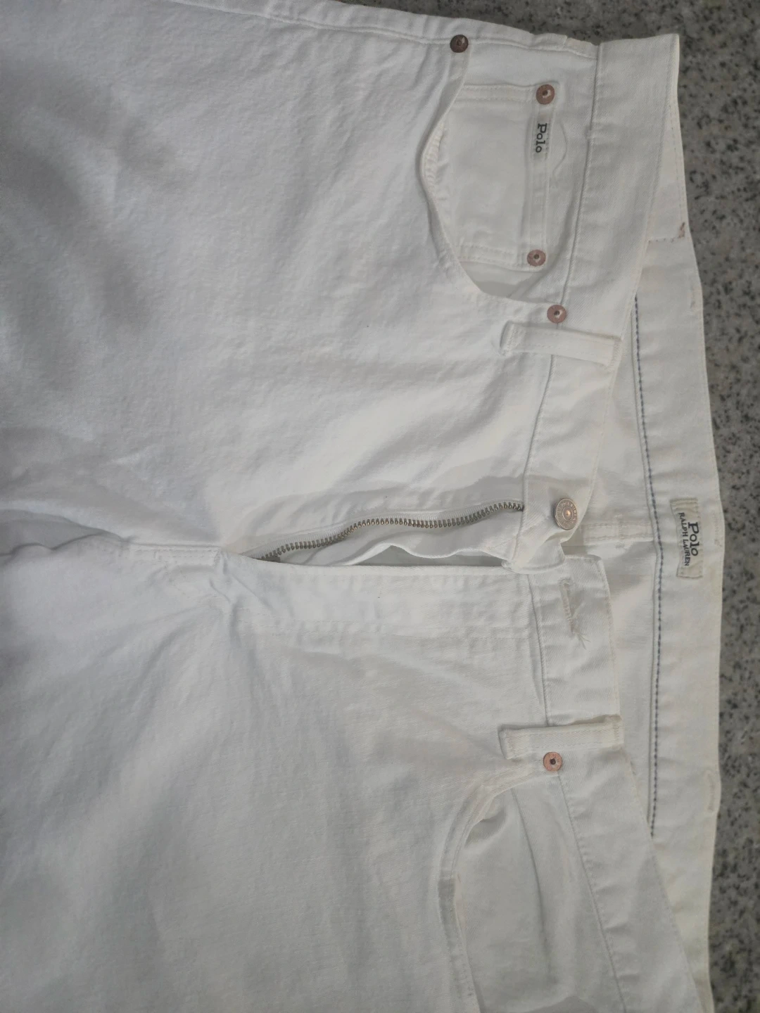 White denim jeans from Polo Ralph Lauren. These trousers are made from a durable cotton blend. They're suitable for casual wear and warmer weather.