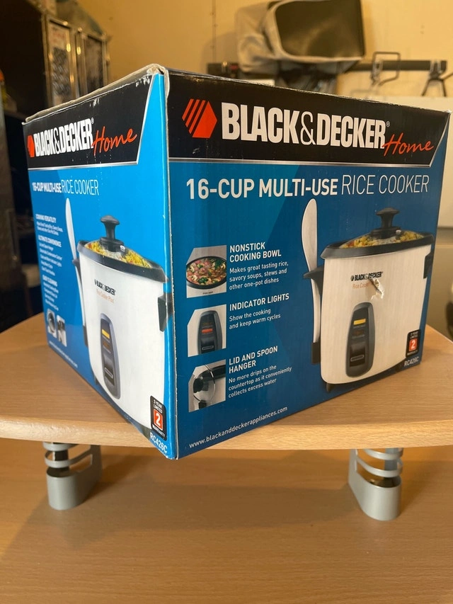 This is a 16-cup Black and Decker multi-use rice cooker, perfect for making delicious rice and more! The cooker features a nonstick cooking bowl, indicator lights, and a convenient lid and spoon hanger. This item is hardly used, in the box. Nonstick Cooking Bowl, Indicator Lights, Lid and Spoon Hanger. If the ad is up, the rice cooker is available, ready to help you create fluffy rice dishes!