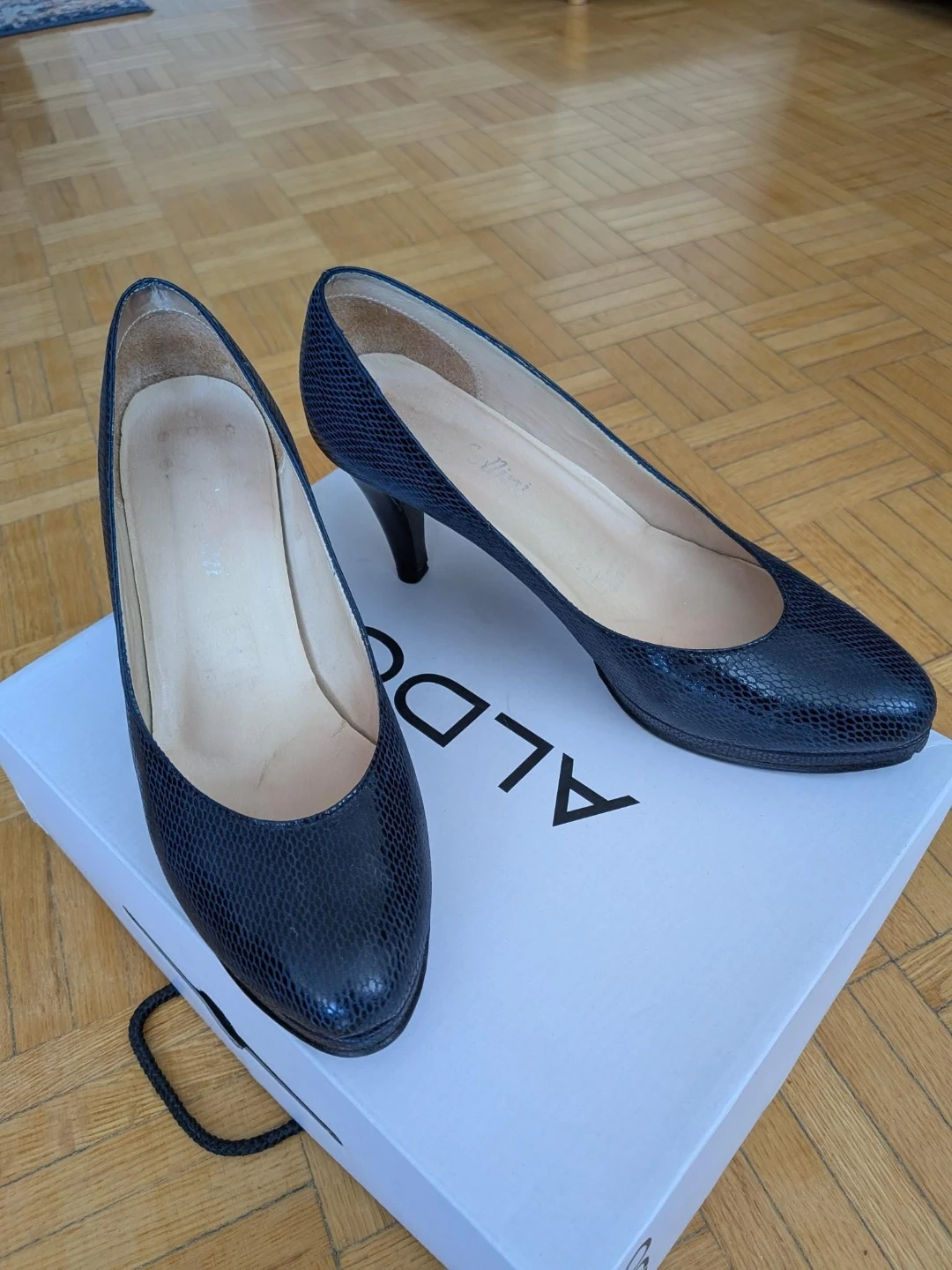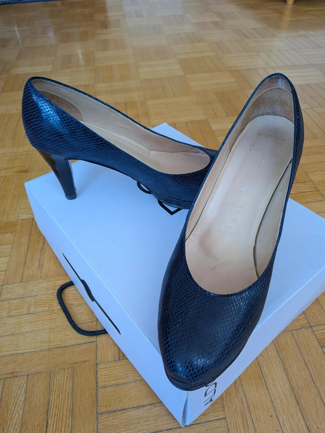 These heels are a stylish navy colour with an embossed texture. They feature a classic pump design with a comfortable heel height. Perfect for dressing up any outfit!