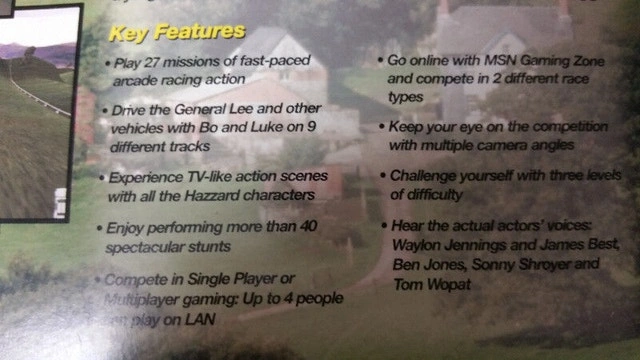 The game's overall story leads to the ultimate goal of thwarting Black Jack Perril. Armed with high-octane vehicles you'll demolish roadblocks, launch over rivers, and blaze through gravel and dirt terrain. Vehicles include tow trucks and pickup trucks, patrol cars, the General Lee, the Double Zero, and Boss Hogg's Gray Ghost. Course locations include Uncle Jesse's farm, Kissin' Cliff, Cooter's garage, Rhuebottom's General Delivery & Dry Goods, the Sumner Farm, Razorback Ridge, and Possum Hollow.