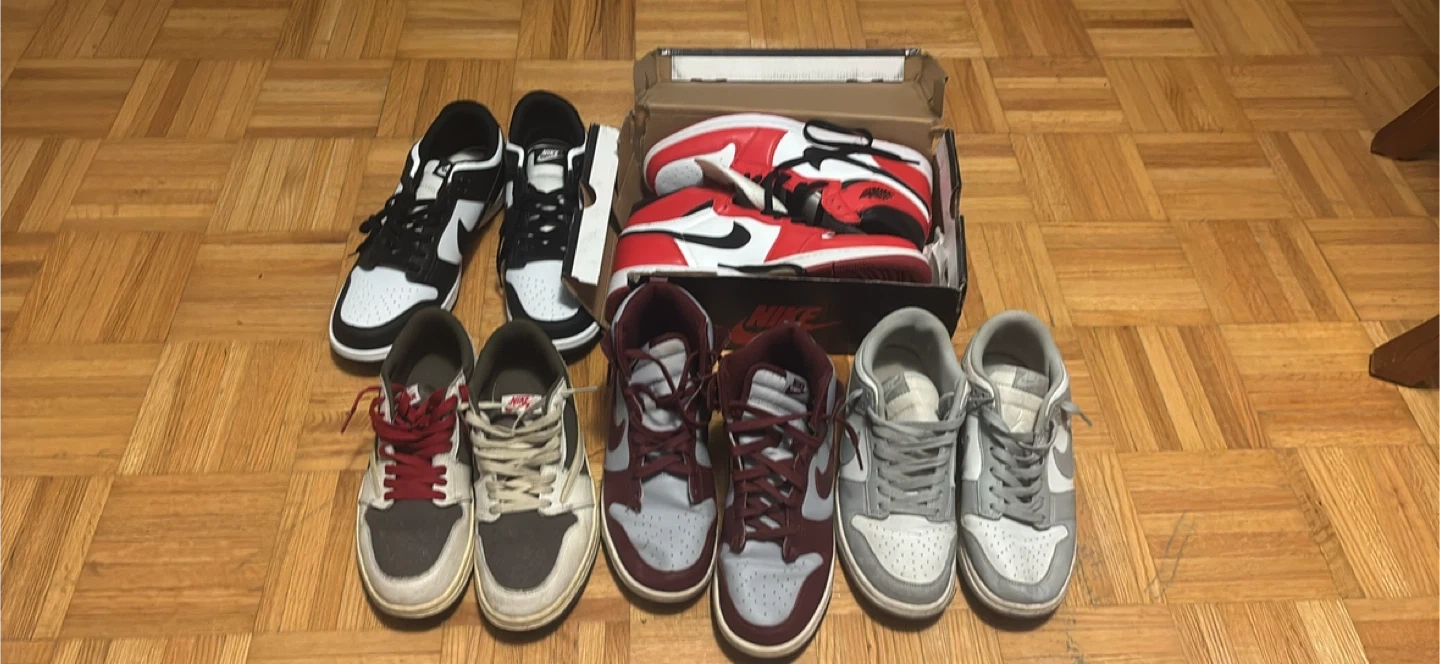 Collection of Nike sneakers featuring Air Jordan 1 and Dunk Low models. Includes pairs in black and white, red and white, maroon and grey, and light grey colourways. These kicks are ready for your next adventure!