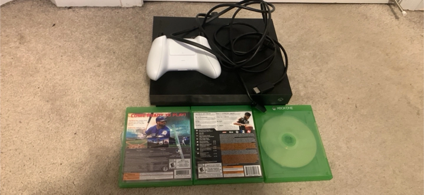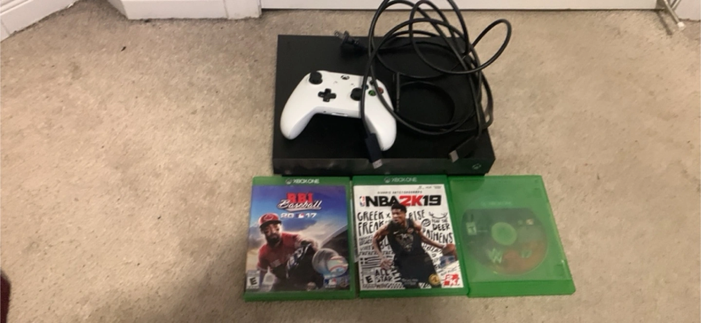 Selling an Xbox One console in good condition. Includes a white controller and power cable. Also comes with three games: RBI Baseball 17, NBA 2K19, and WWE game.