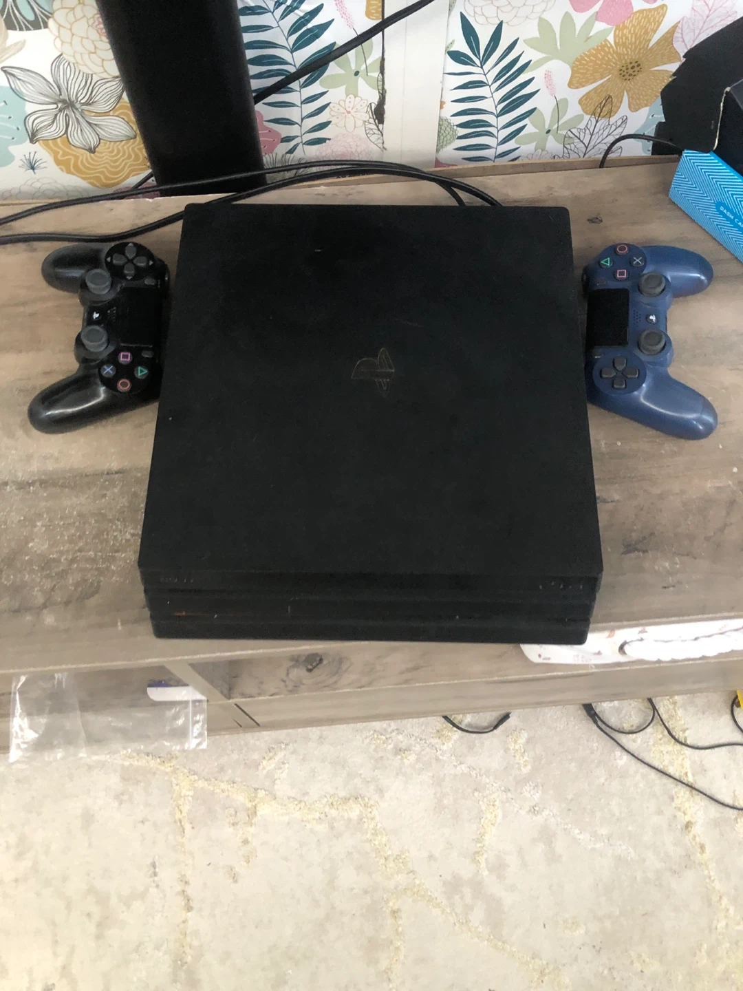 This is a black PlayStation 4 Pro console with 1TB of storage. It comes with two controllers, one black and one blue. It's in good working condition and ready for a new home!