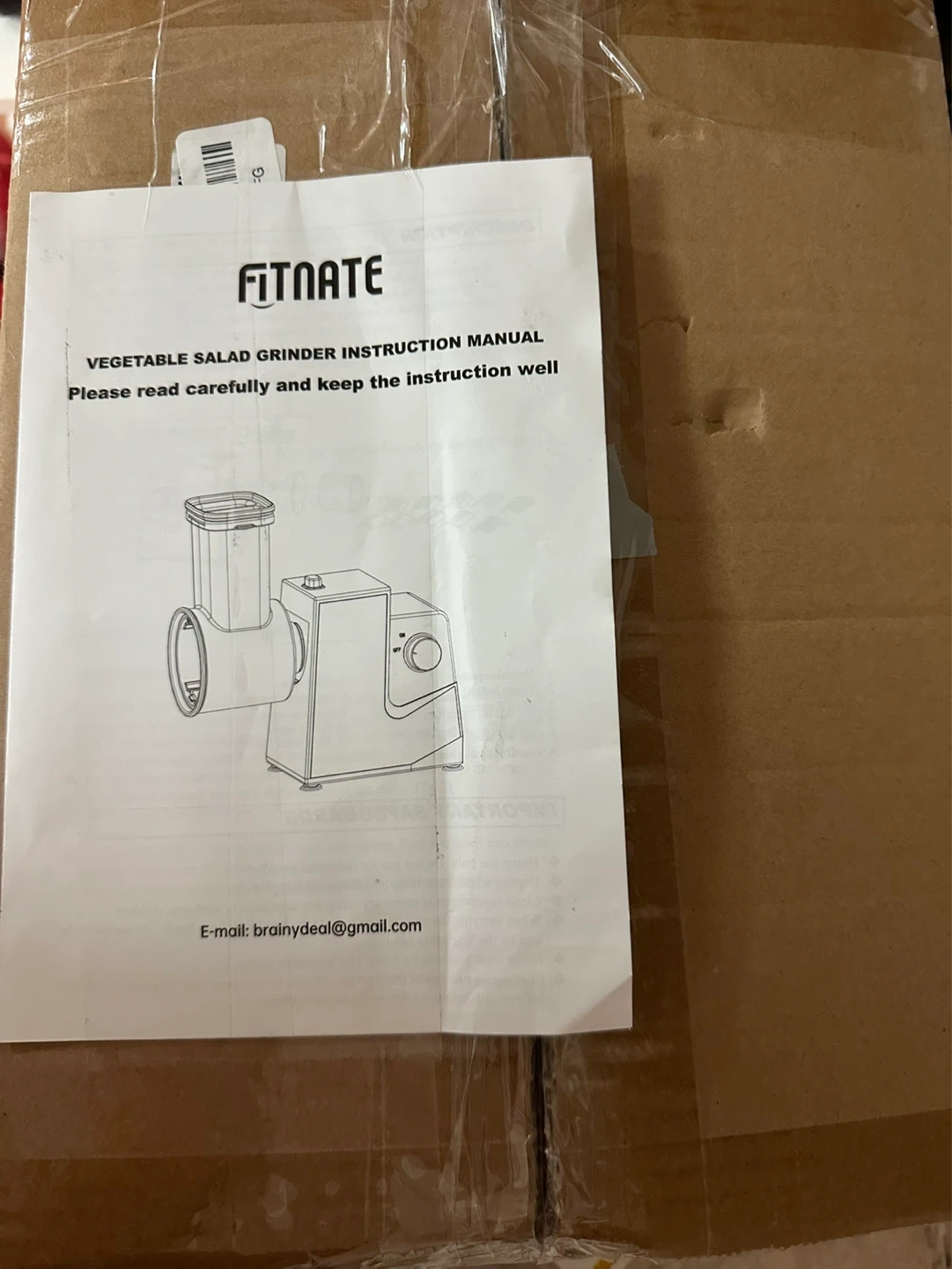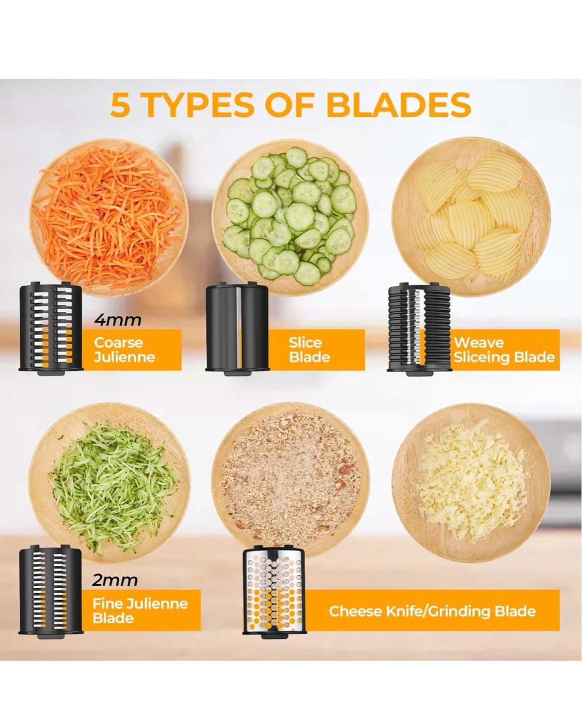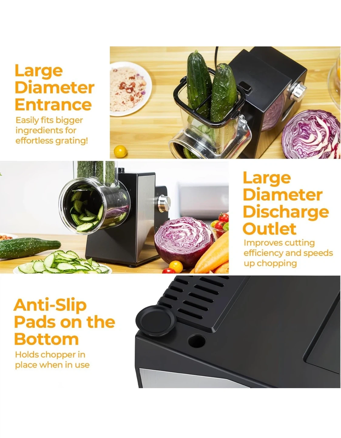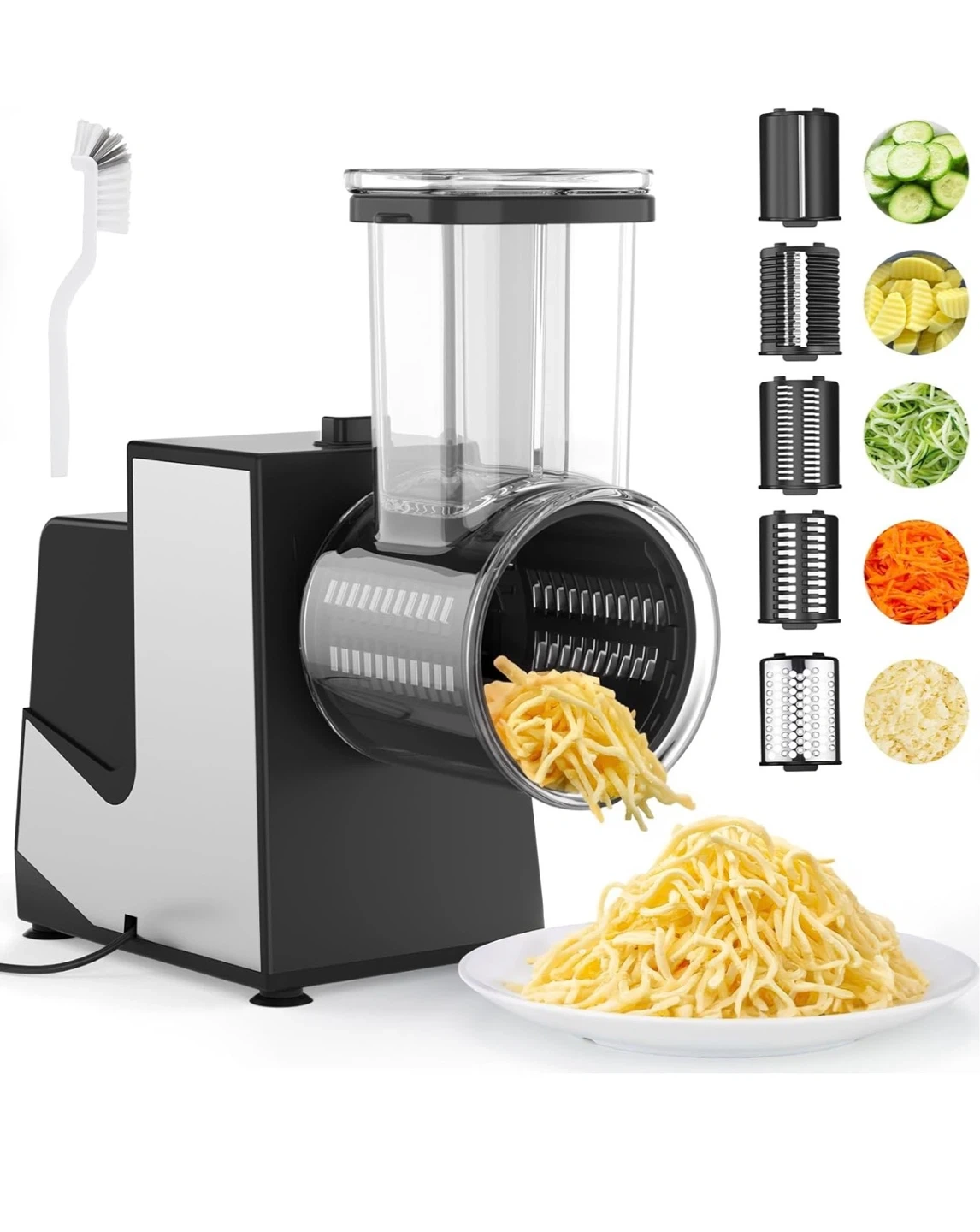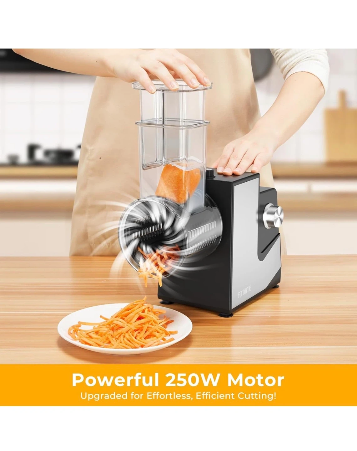 This Fitrate electric food slicer and grater features a powerful 250W motor for efficient chopping. It comes with 5 types of blades including coarse julienne, slice, weave slicing, fine julienne, and a cheese knife/grinding blade. Anti-slip pads on the bottom help hold the unit in place.