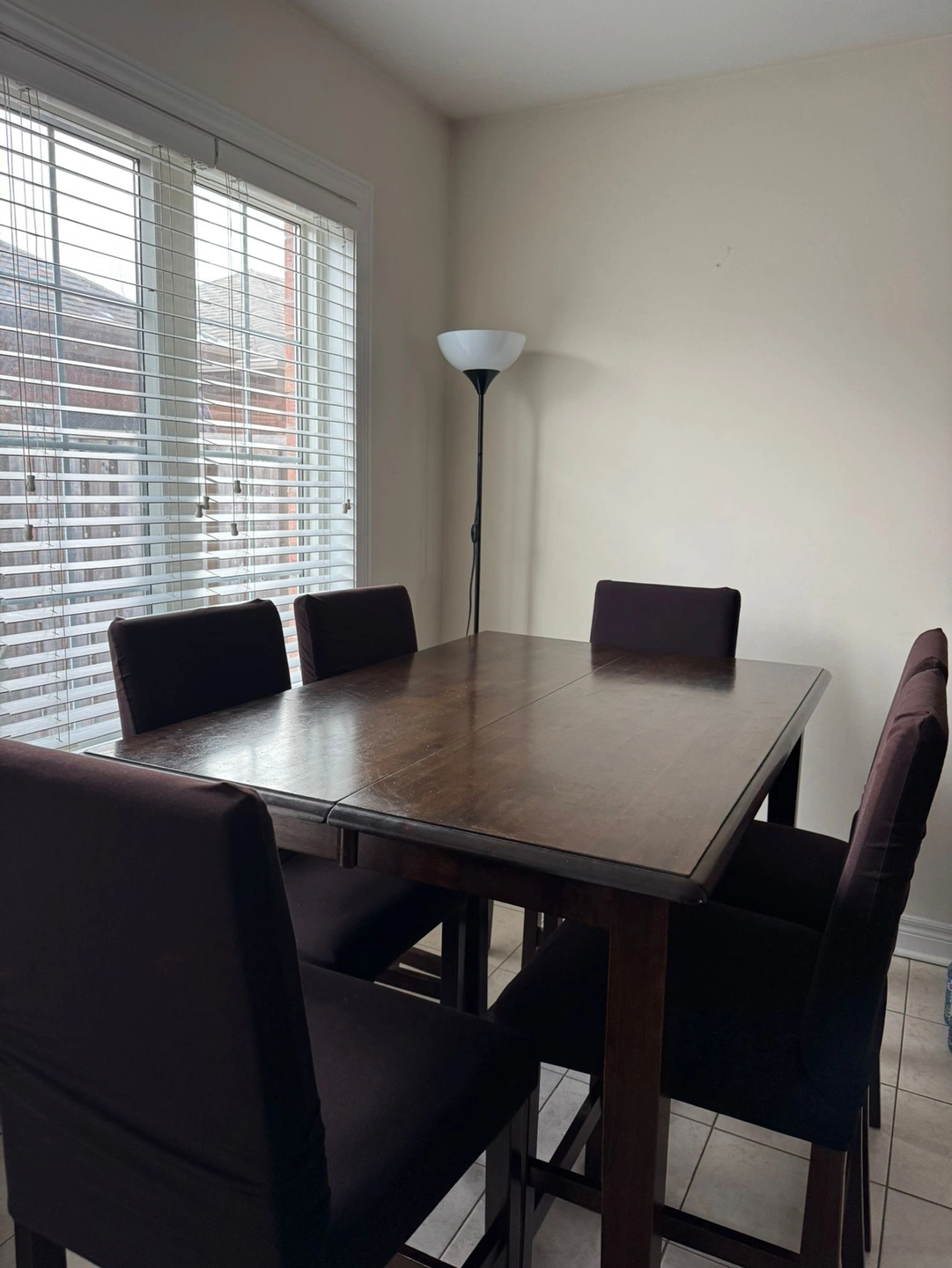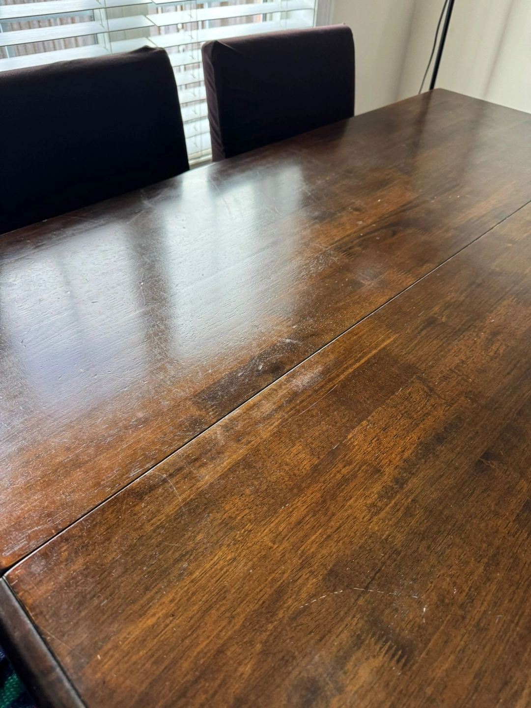 Extendable wood dining table and 8 chairs. 8 chairs can be used when table is extended or 6 when shortened. Chairs have cover due to normal wear and tear. Table as is no major issues.