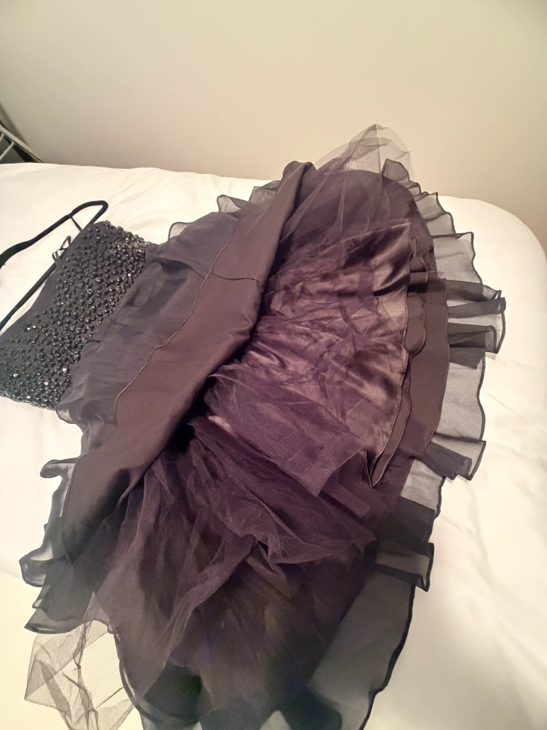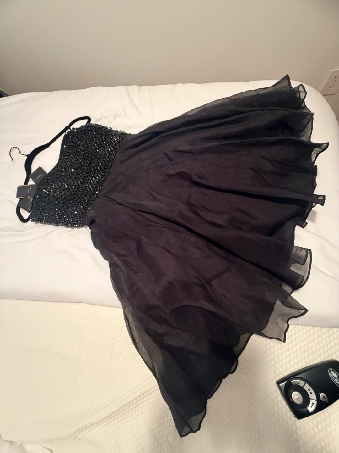 This is a stunning black Ted Baker party dress. It features a heavily embellished bodice with sparkling black beads. The skirt is made of flowy, sheer fabric for a beautiful silhouette. Size is 2- Equivalent to size 6. New with Tags.