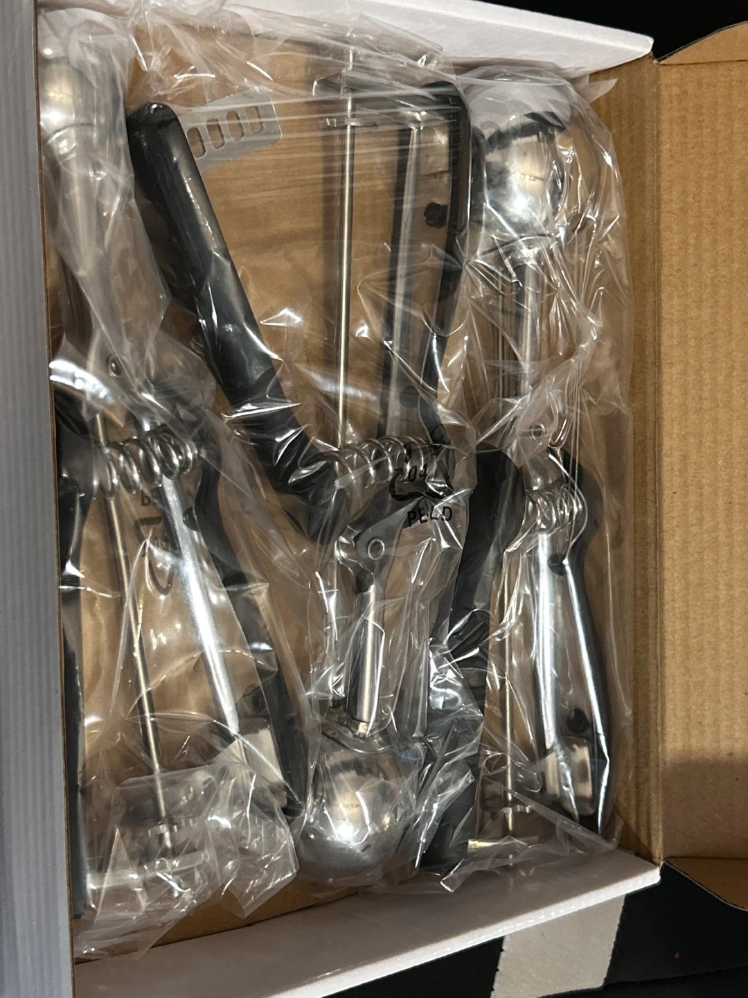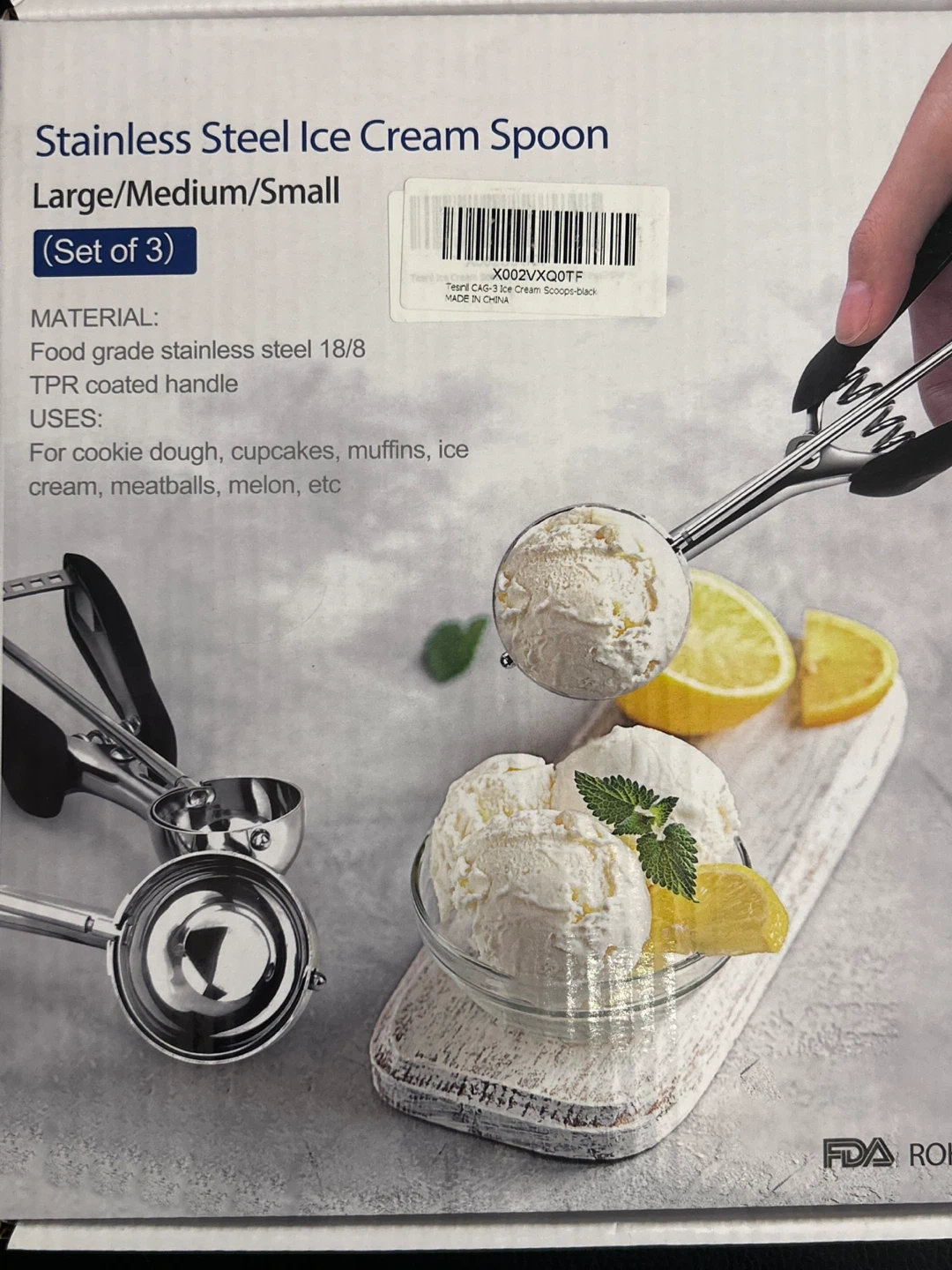 Selling a Smyidel Ice Cream Scoop Set, which includes three different sizes: large, medium, and small. They are made of food-grade stainless steel 18/8 with a TPR coated handle. Great for cookie dough, cupcakes, muffins, ice cream, meatballs, melon, and more!