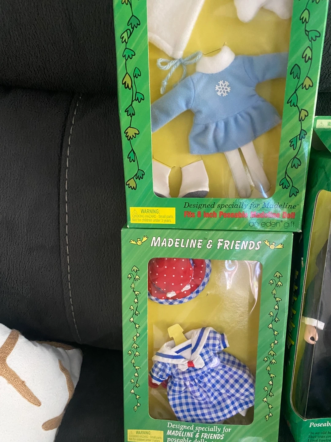 Three poseable Madeline & Friends dolls are included. There's a nun doll, a doll named Pepito in a red coat, a blue gingham dress and a blue snowflake dress. They come in their original packaging.