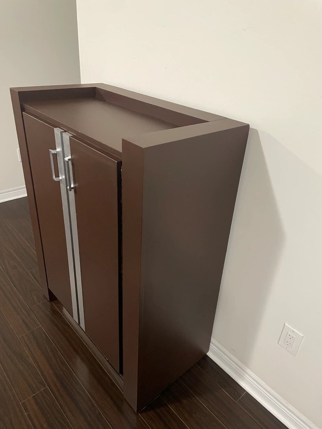 A brown cabinet featuring double doors with silver handles. It has internal shelving and drawers. This cabinet offers ample storage space for various items.