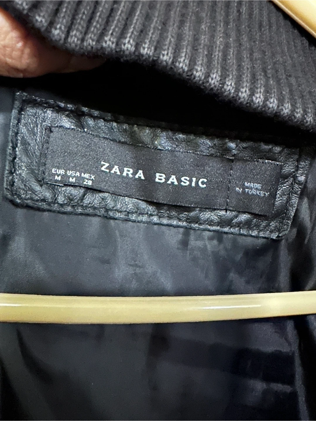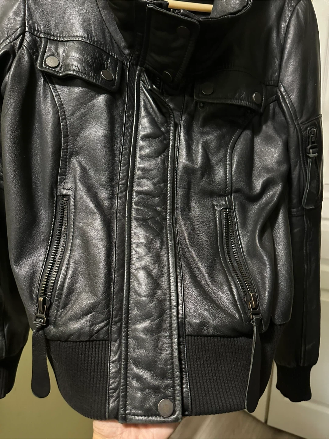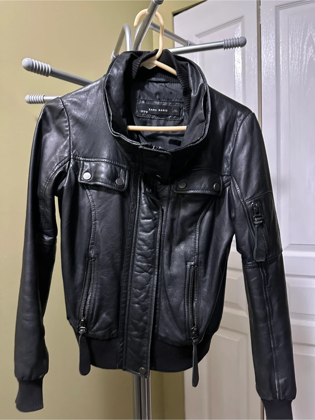 Selling a Zara Basic black leather bomber jacket in size medium. (I guess it fits up to 120 pounds, 1.6 m tall) The outershell is 100% leather and the lining is 100% polyester. It's in good condition and all zippers work. Very soft to touch. However, there is scuff around both sleeves, and the price is adjusted accordingly