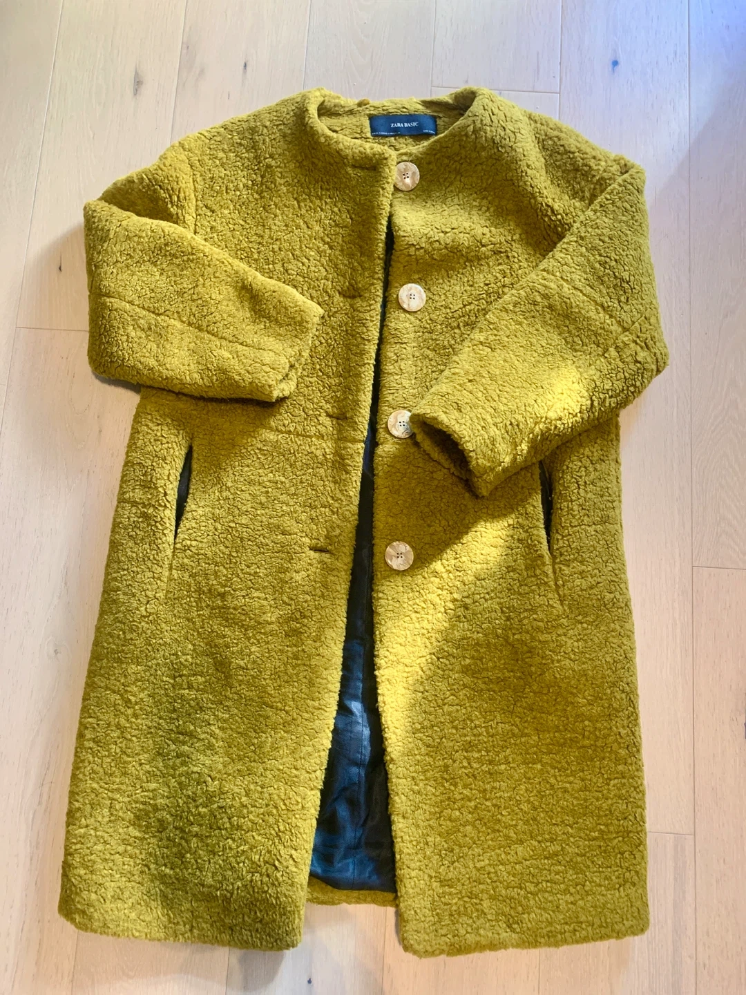 31Selling a Zara Basic teddy coat in a unique yellow colour! It's a size S and has a cozy, warm feel. Very thick perfect condition only worn twice Length 97cm Chest 114cm