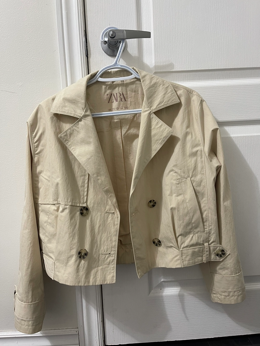 58Beige cropped trench jacket with a double-breasted closure, belt, and long sleeves.