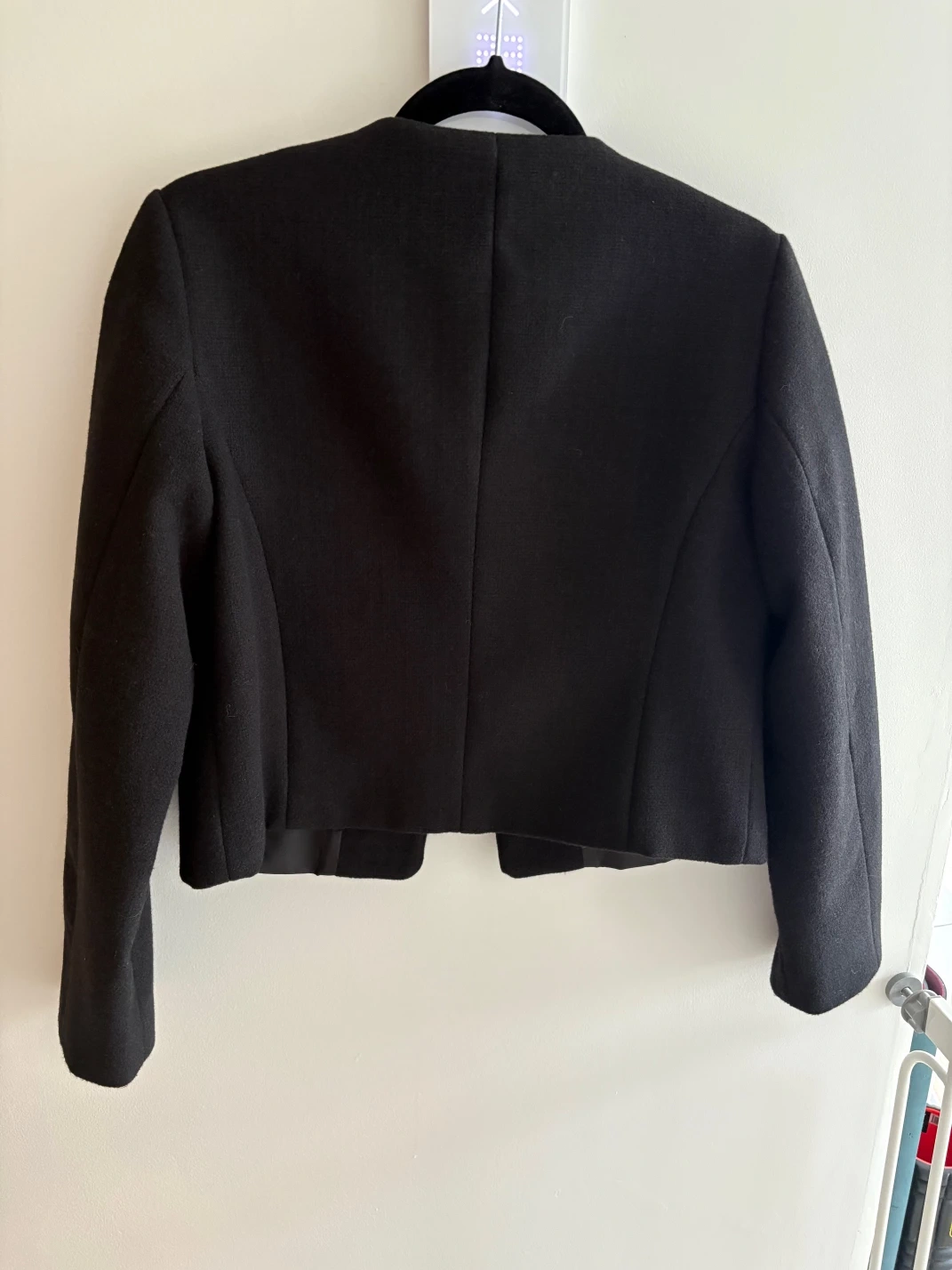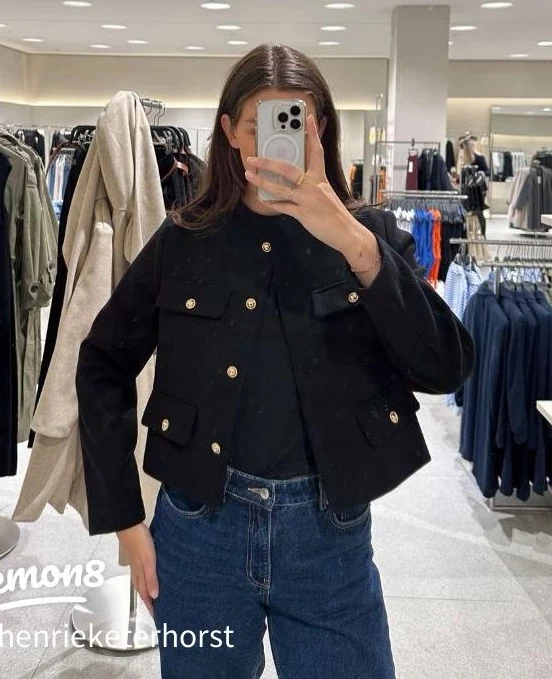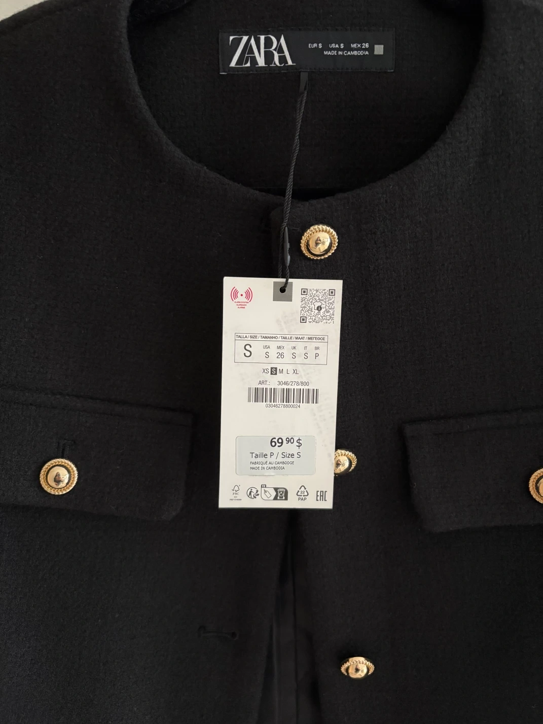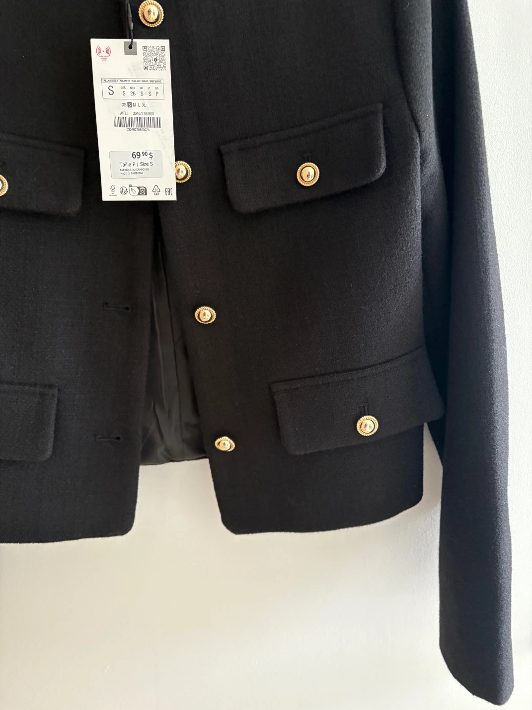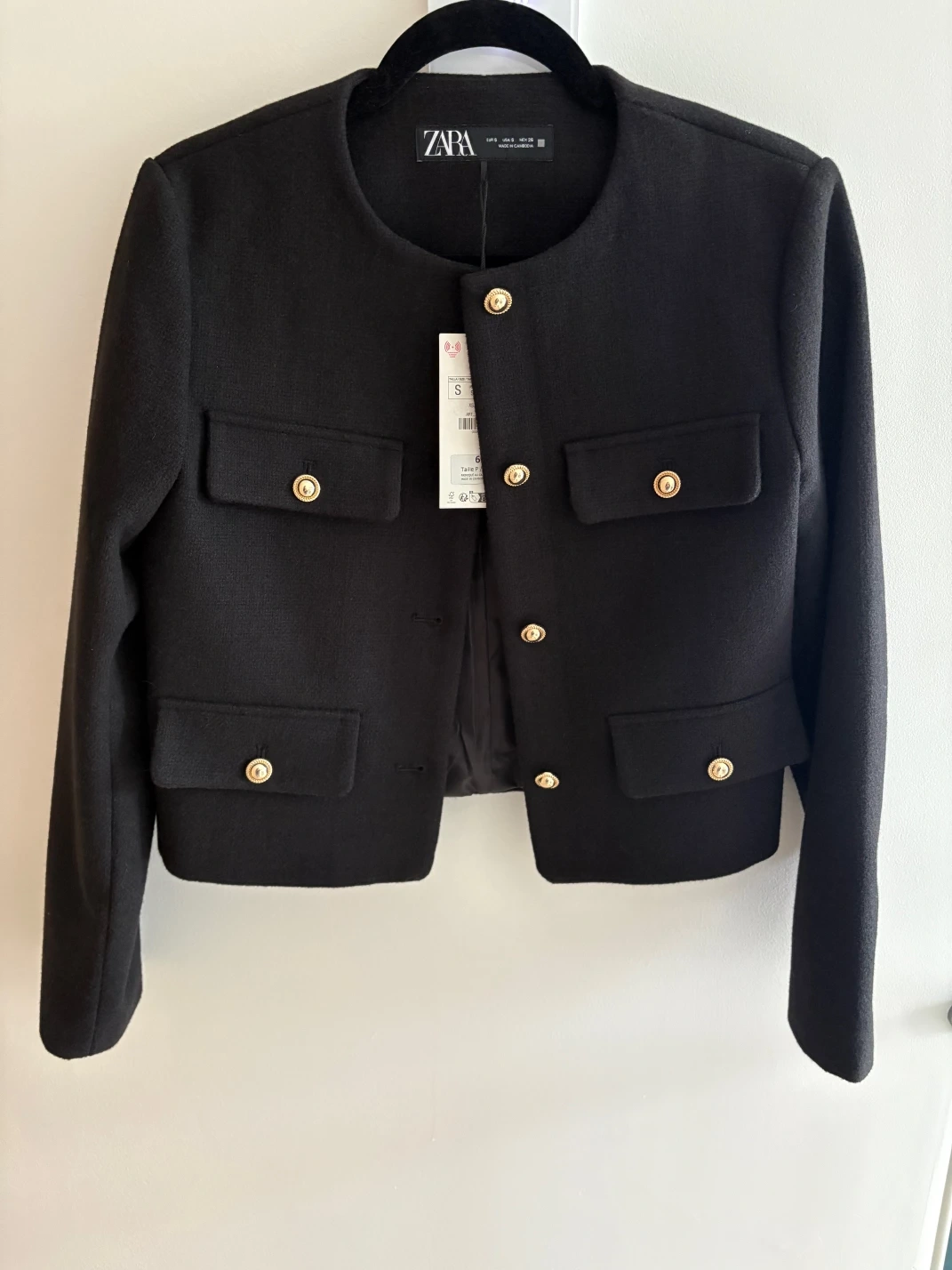 52Black cropped blazer. Gold button accents. Two flap pockets. Size small. Made in Cambodia.
