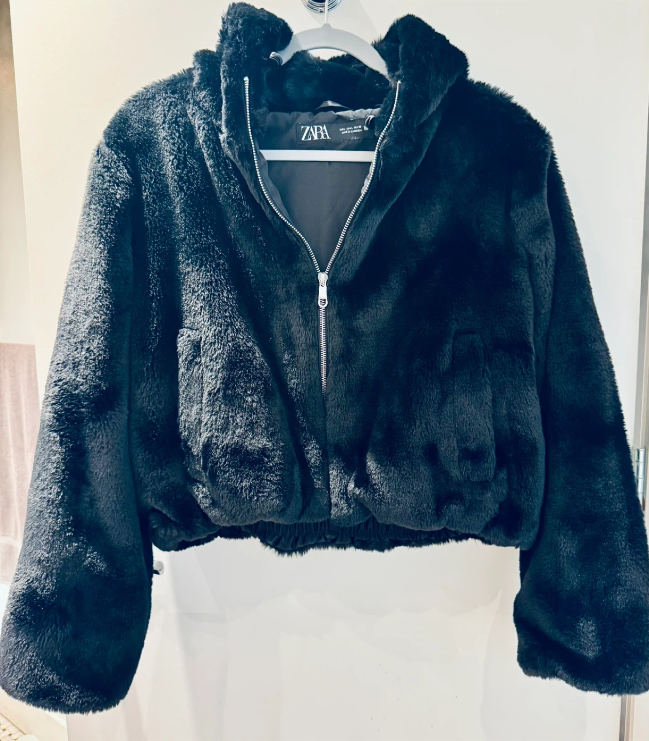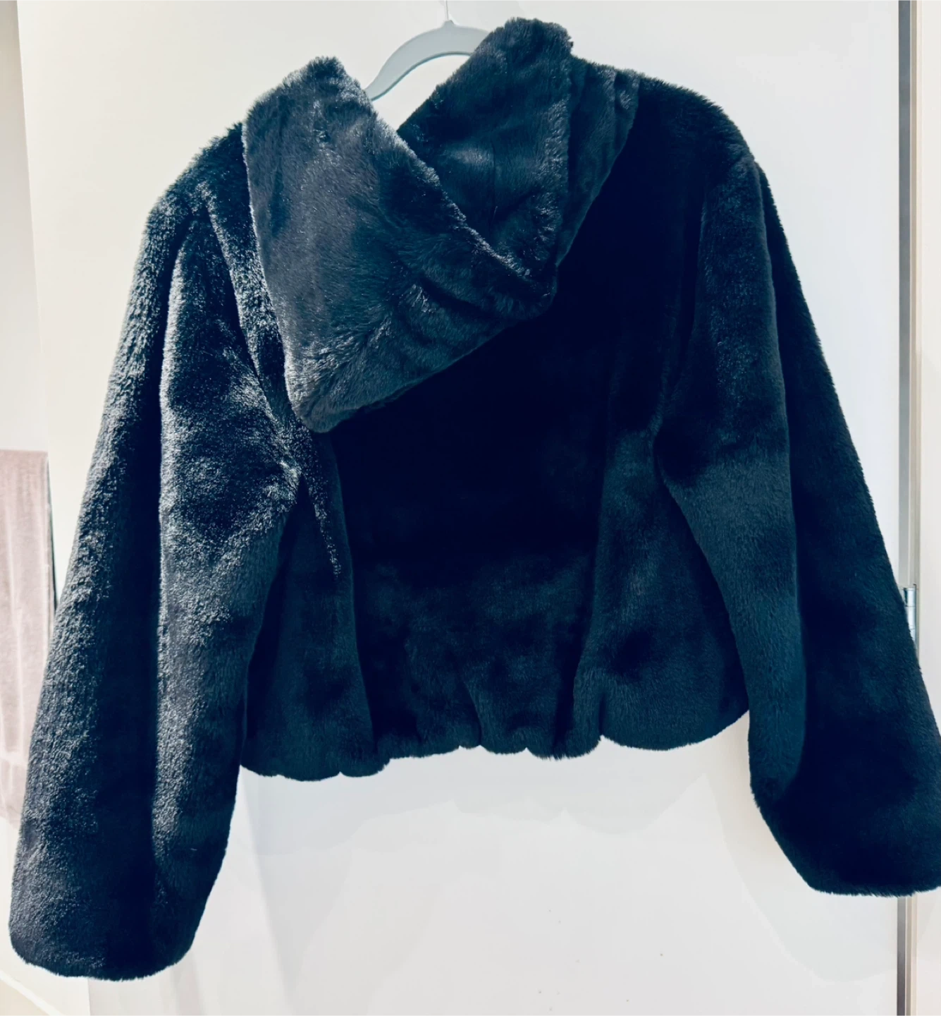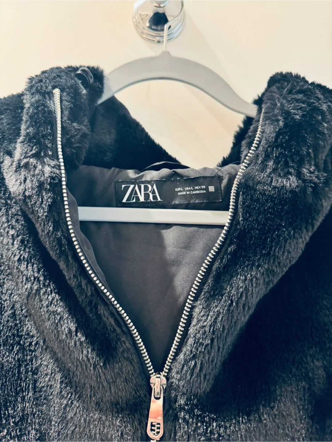 15Zara Black Faux Fur Hoodie Jacket Size L New without tags Jacket with hoodie and long sleeves. Side pockets. Adjustable hem with interior side drawstrings. Front zipper closure.