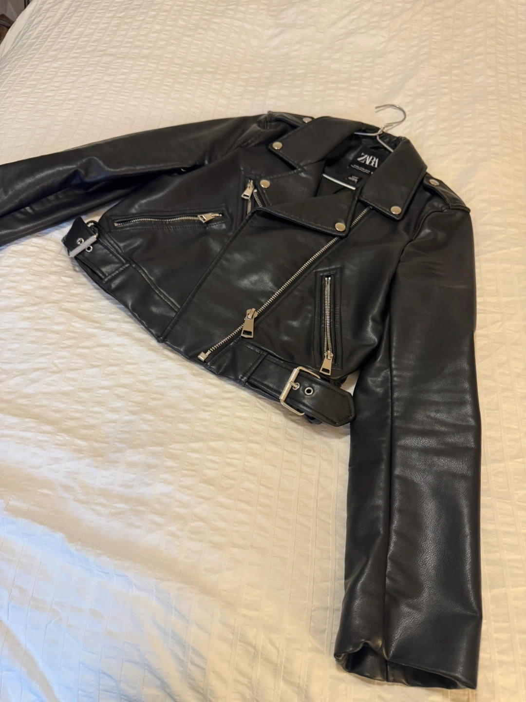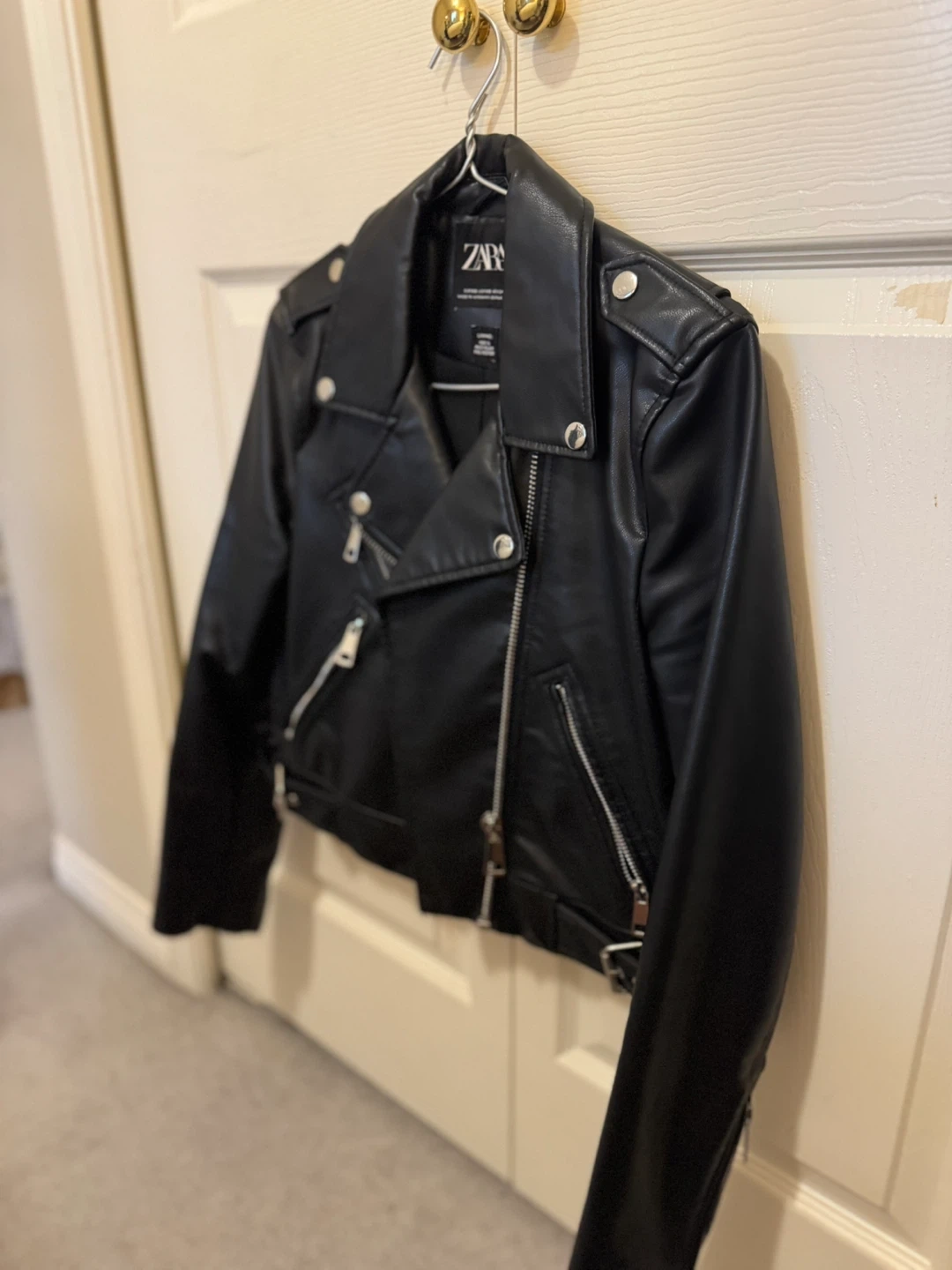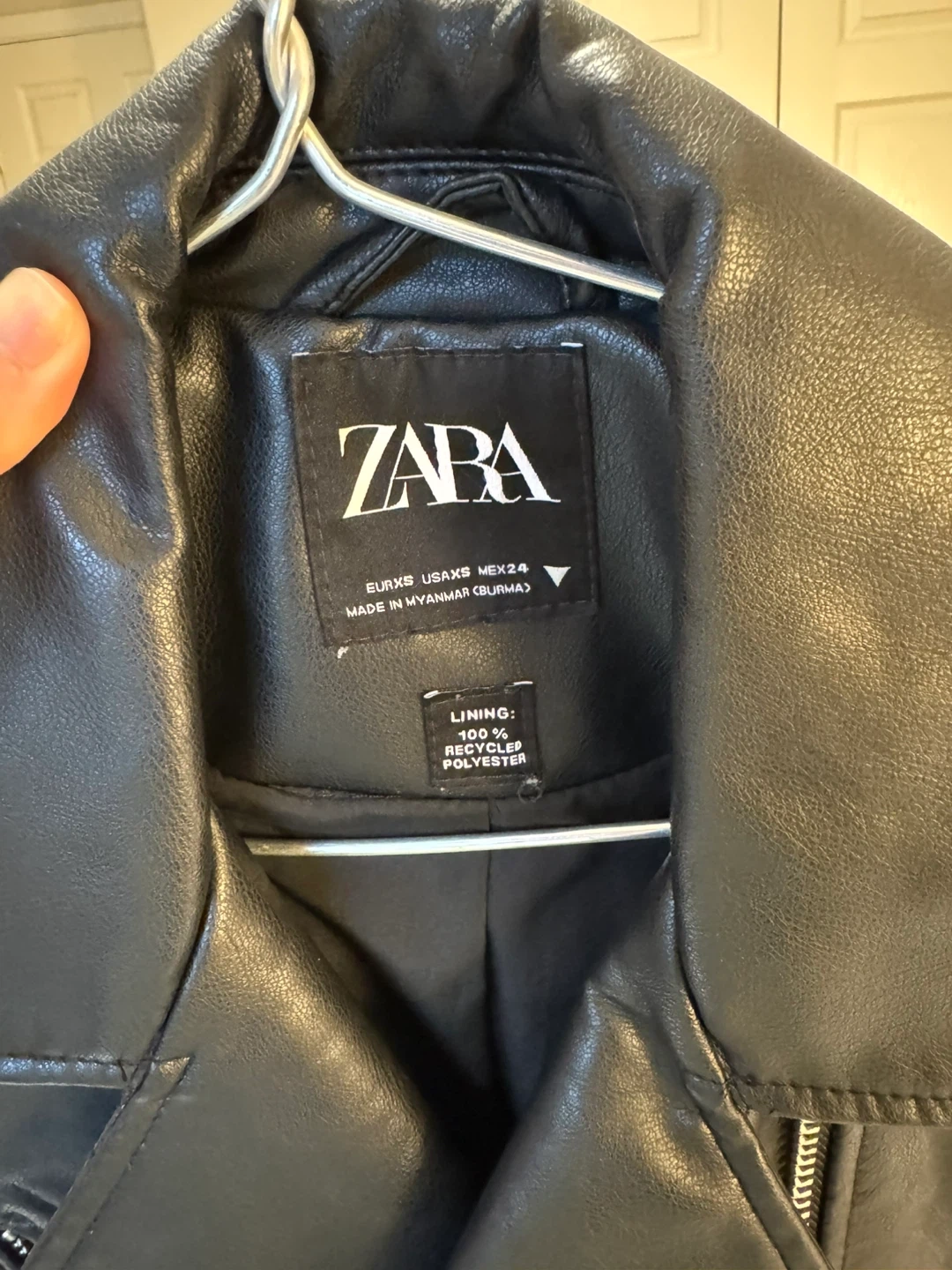 10Selling a Zara black faux leather biker jacket in size XS. The lining is 100% recycled polyester. It's in great condition and ready for a new home!