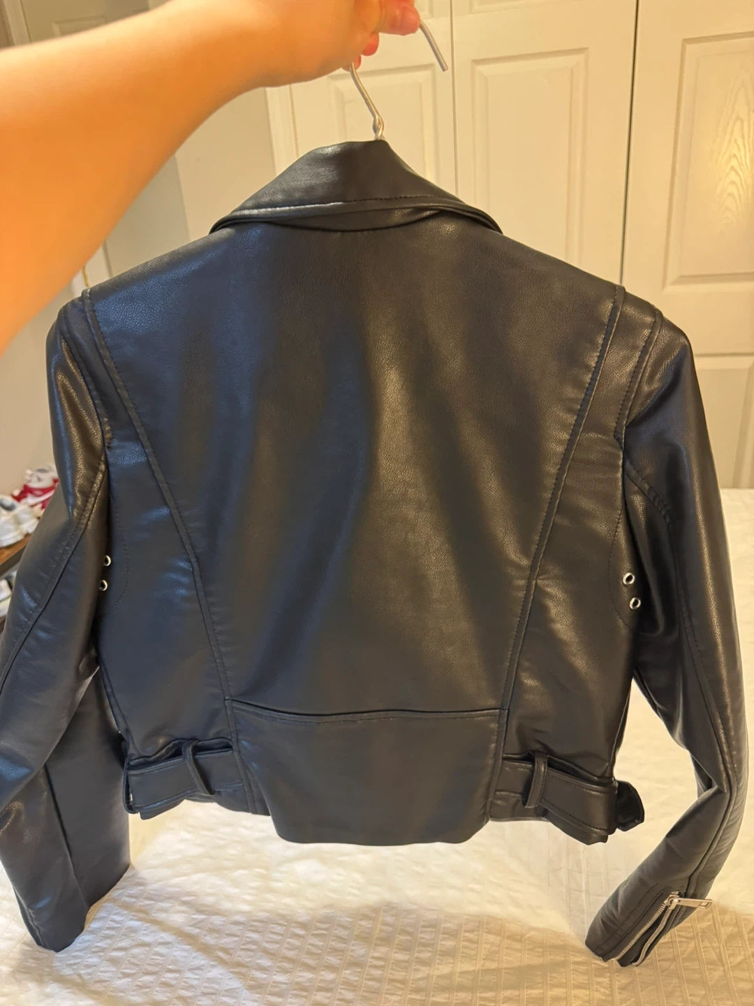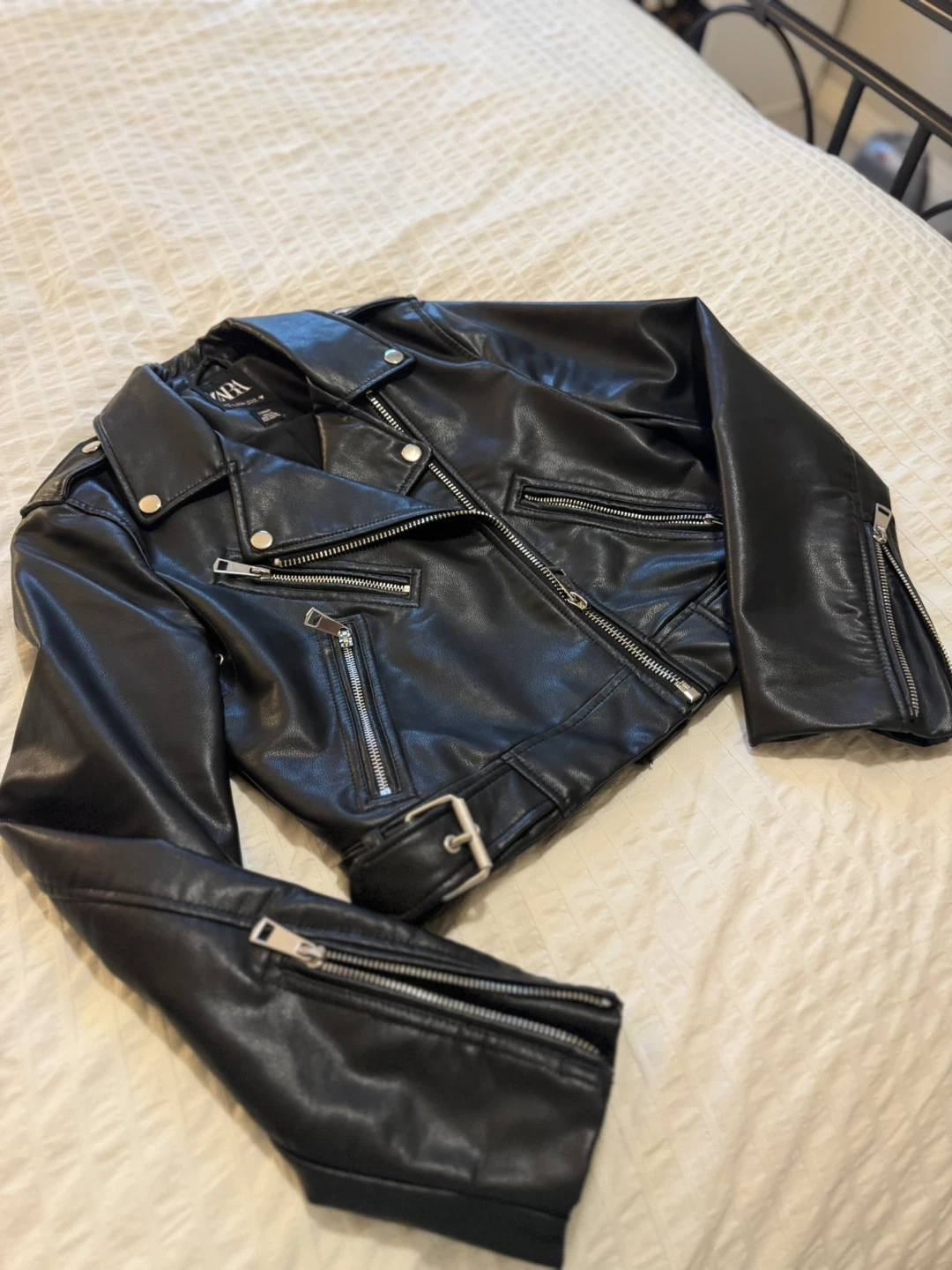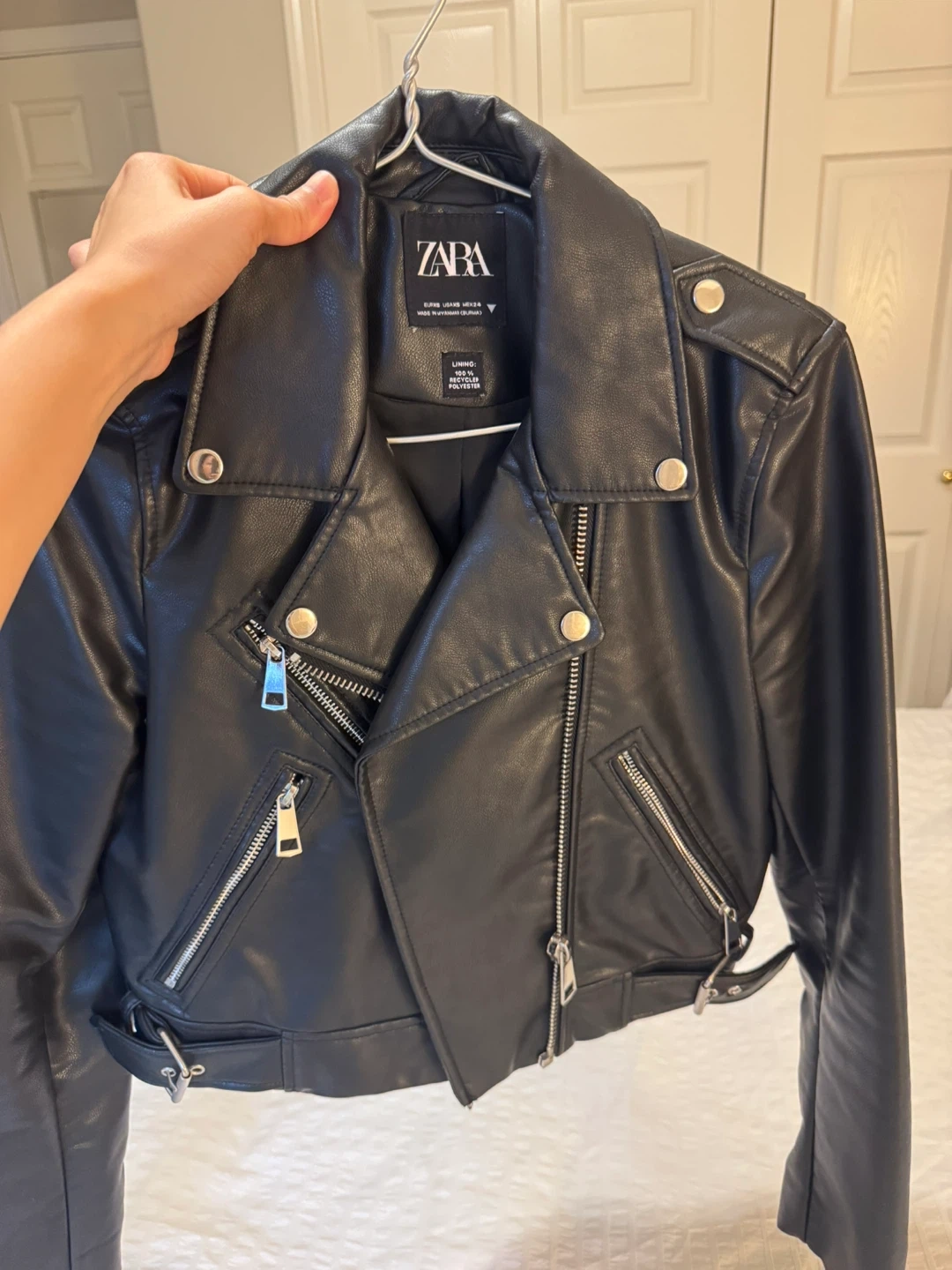 10Selling a Zara black faux leather biker jacket in size XS. The lining is 100% recycled polyester. It's in great condition and ready for a new home!