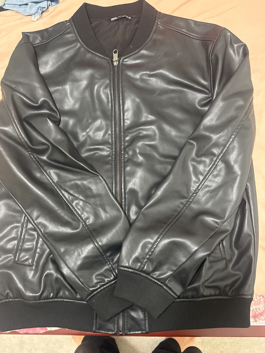 18Selling a Zara black faux leather bomber jacket in size L. It's in great condition and perfect for layering. The material is soft and comfortable, making it a stylish addition to any outfit