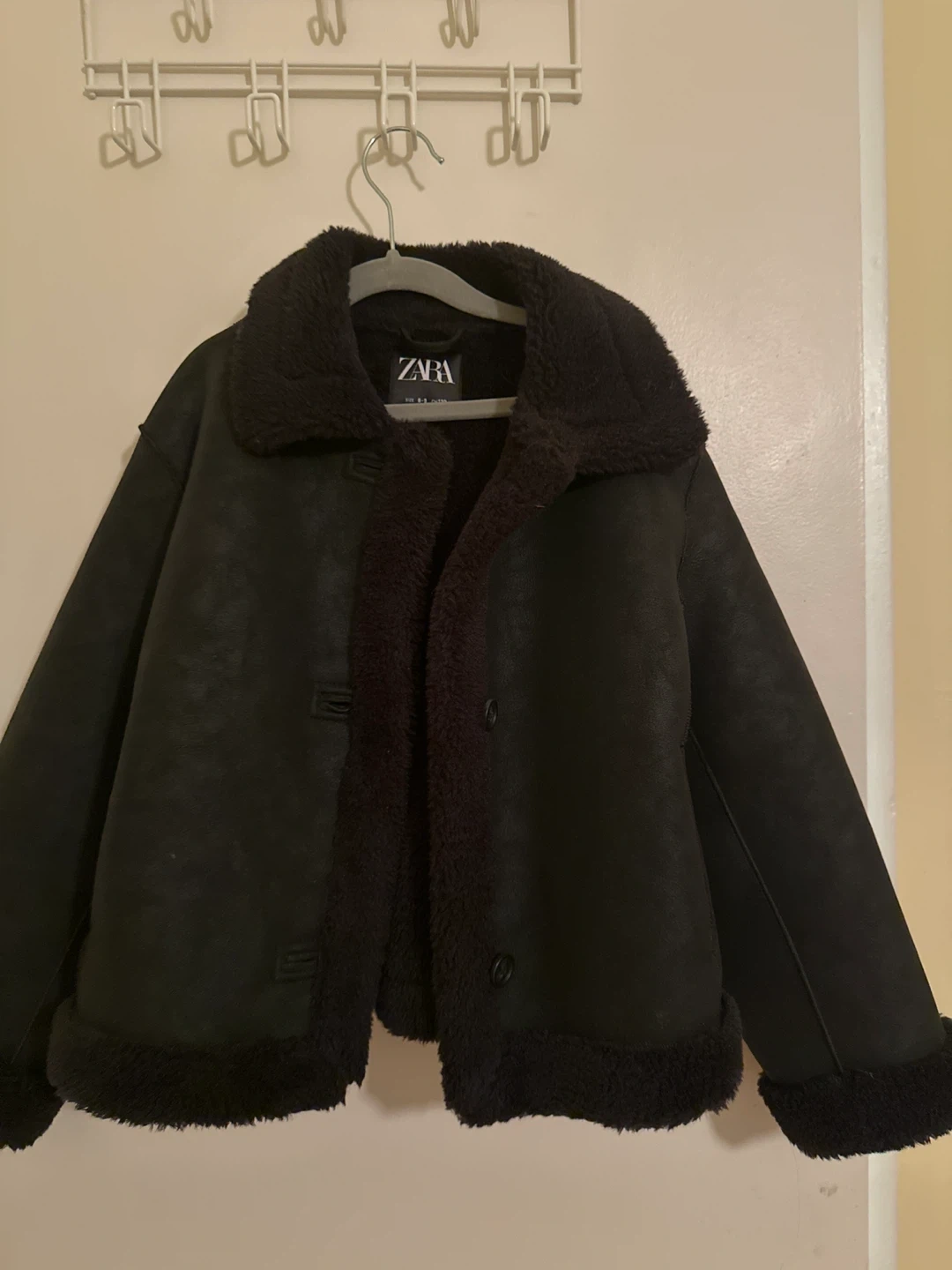 Selling a Zara black faux shearling jacket in size S. It's in great condition and perfect for the colder weather!