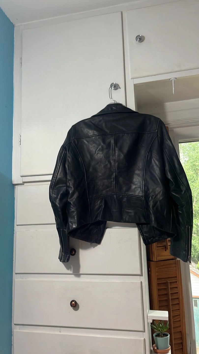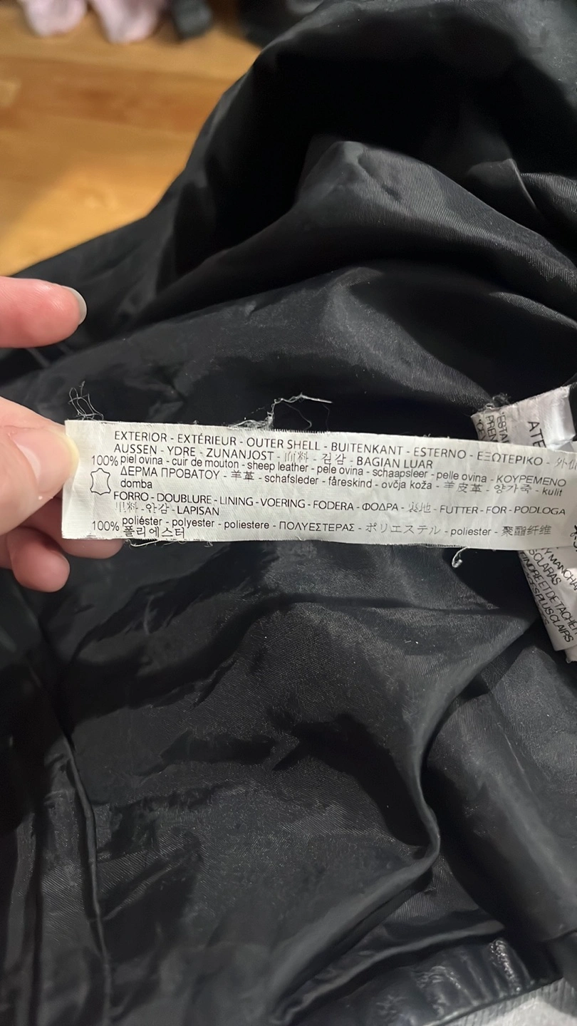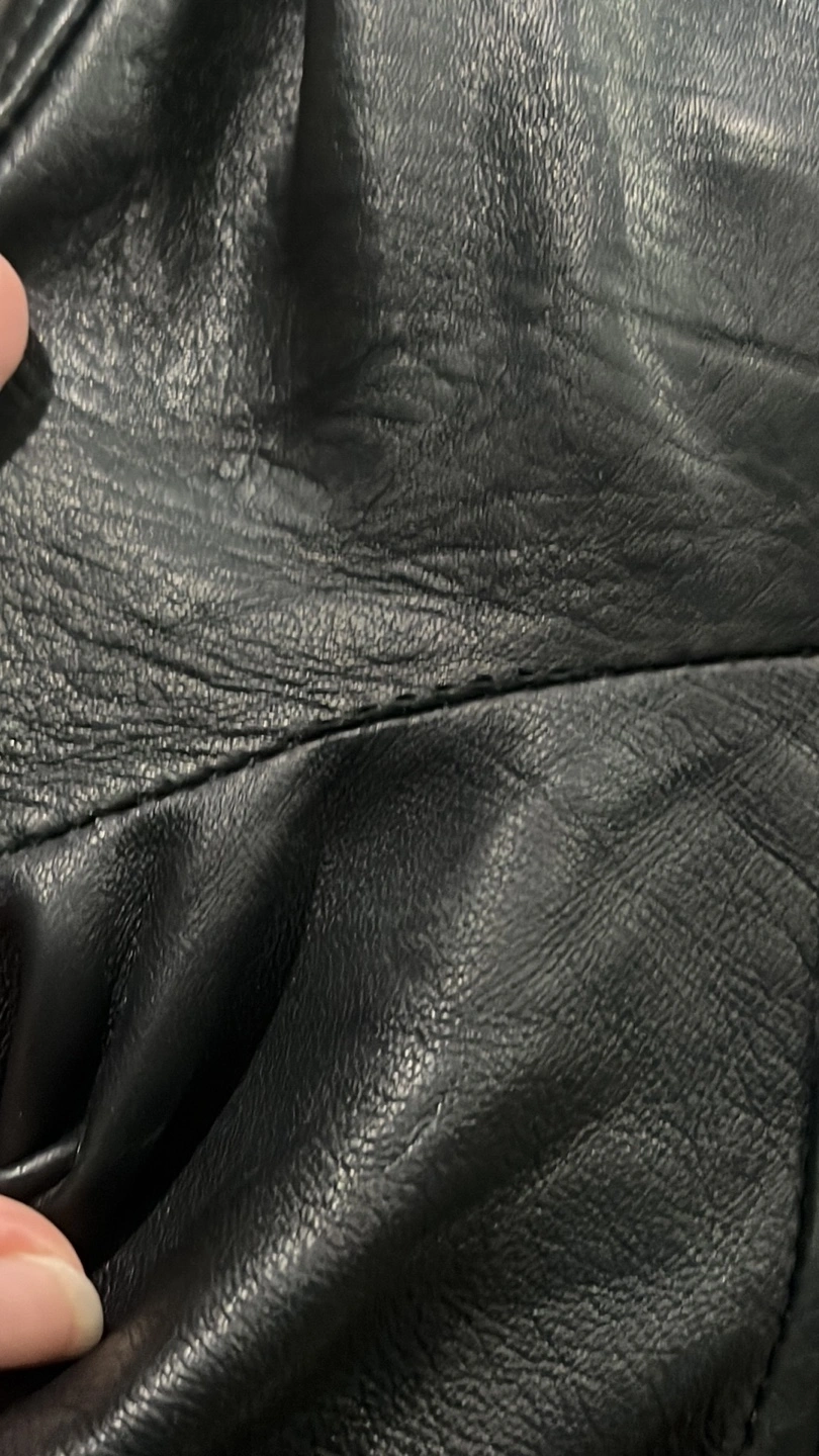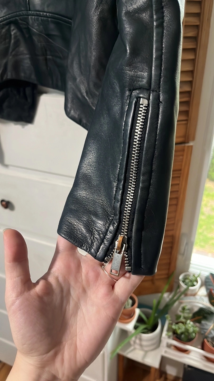 55Black sheep leather jacket with a zipper closure, two zipper pockets on the front, and zippers on the sleeves. Worn for a year, in good pre-loved condition. Minor tarnishing on metal hardware, and some distressing around the stitching under the right sleeve (both pictured).