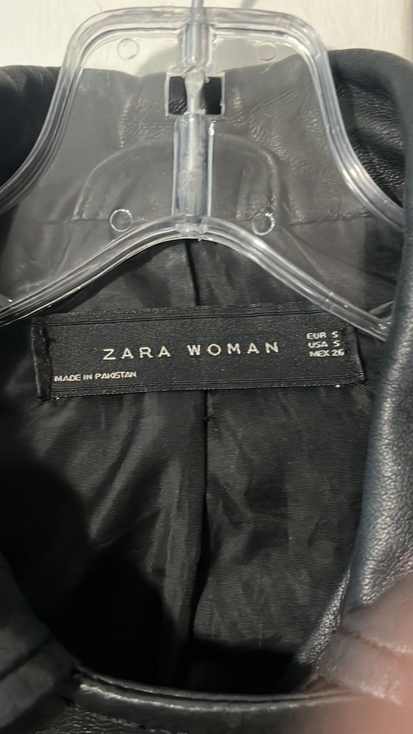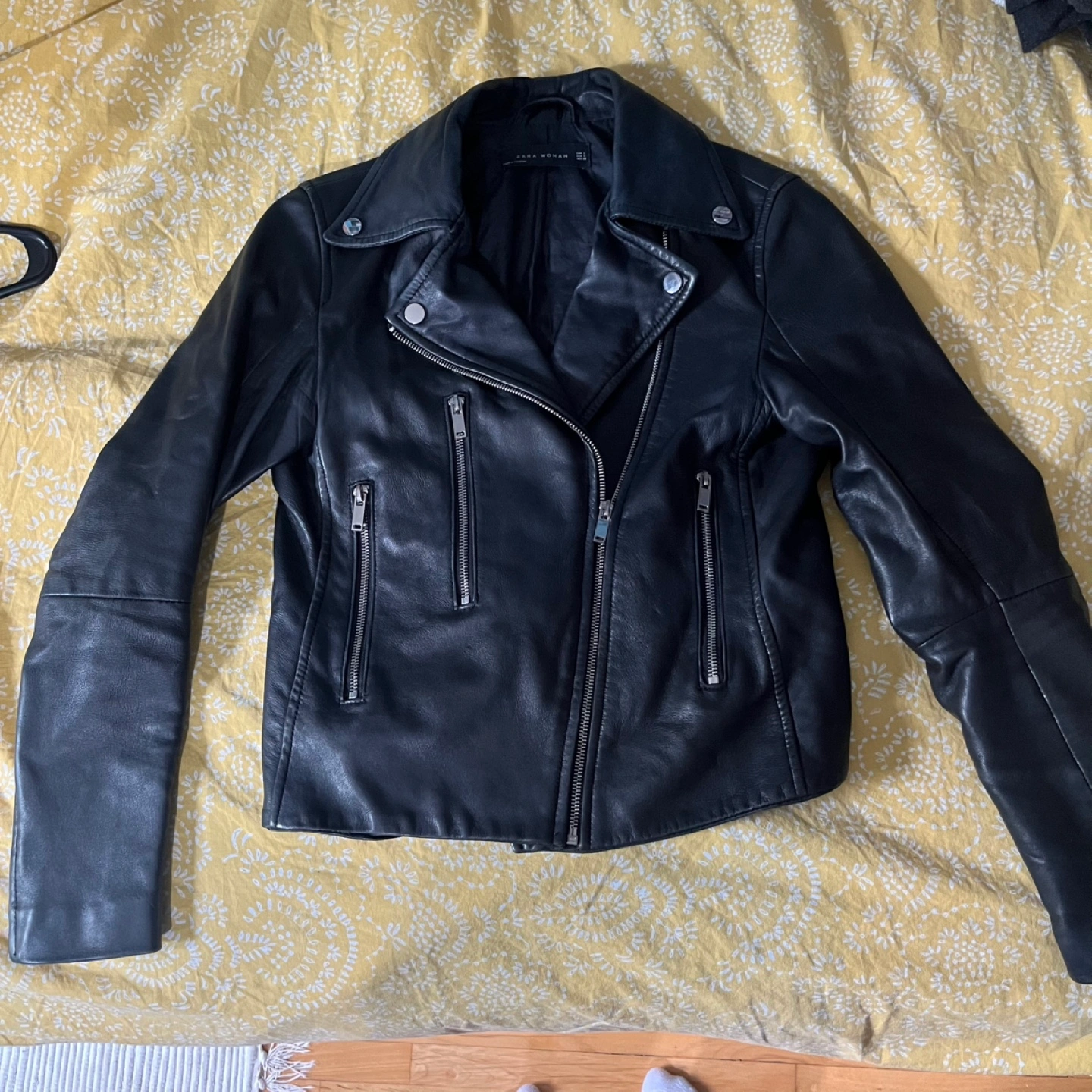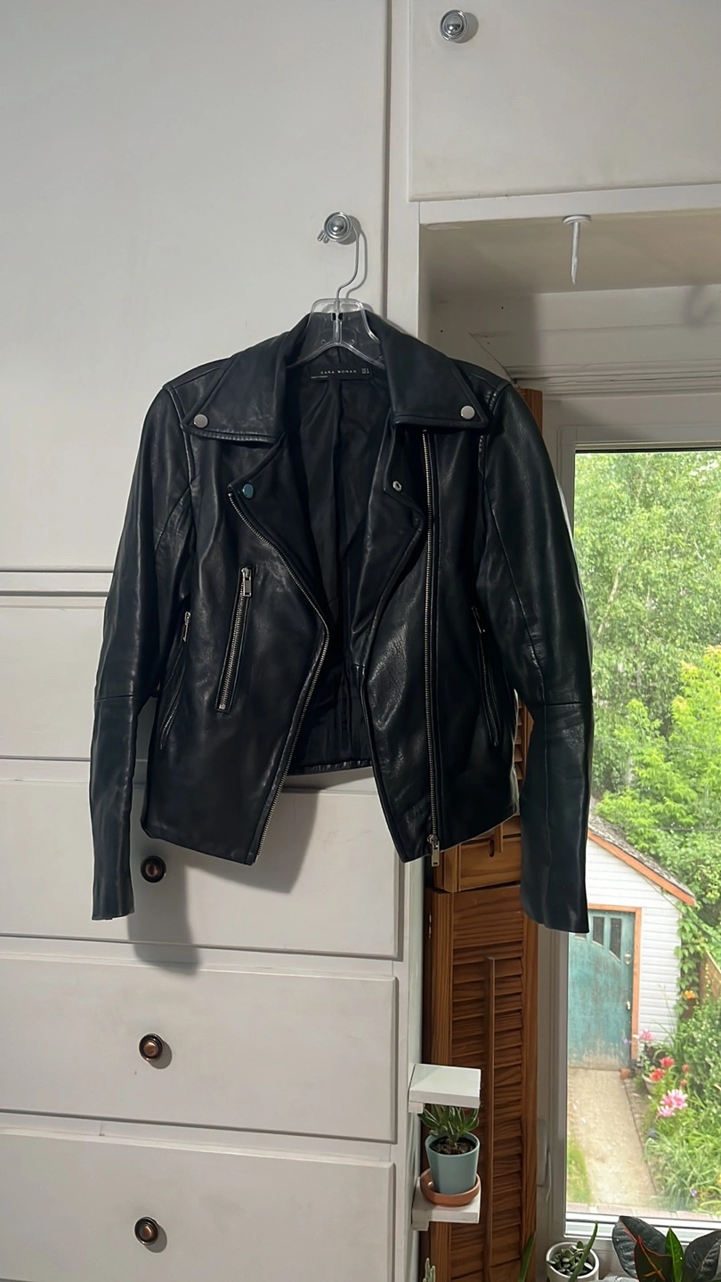 55Black sheep leather jacket with a zipper closure, two zipper pockets on the front, and zippers on the sleeves. Worn for a year, in good pre-loved condition. Minor tarnishing on metal hardware, and some distressing around the stitching under the right sleeve (both pictured).