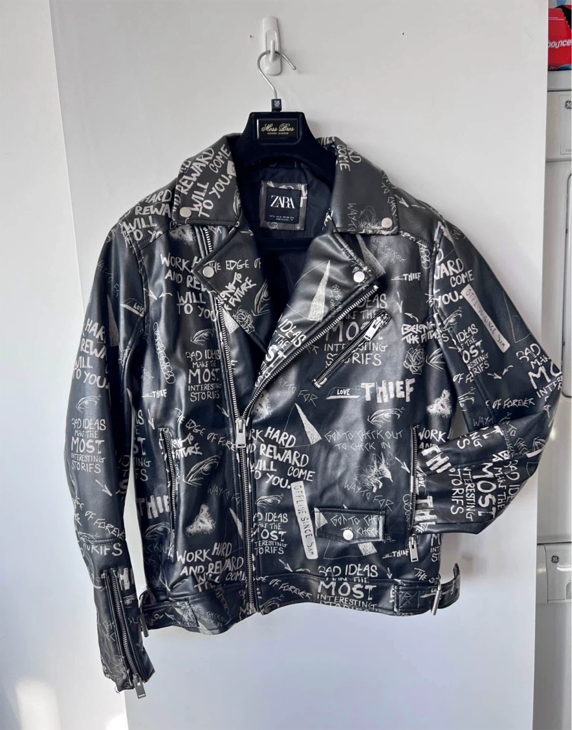 65Zara faux leather jacket in a size large! This jacket is black and features a unique graffiti print all over. It's in great condition and ready for a new home. Perfect for adding a bit of edge to your wardrobe!