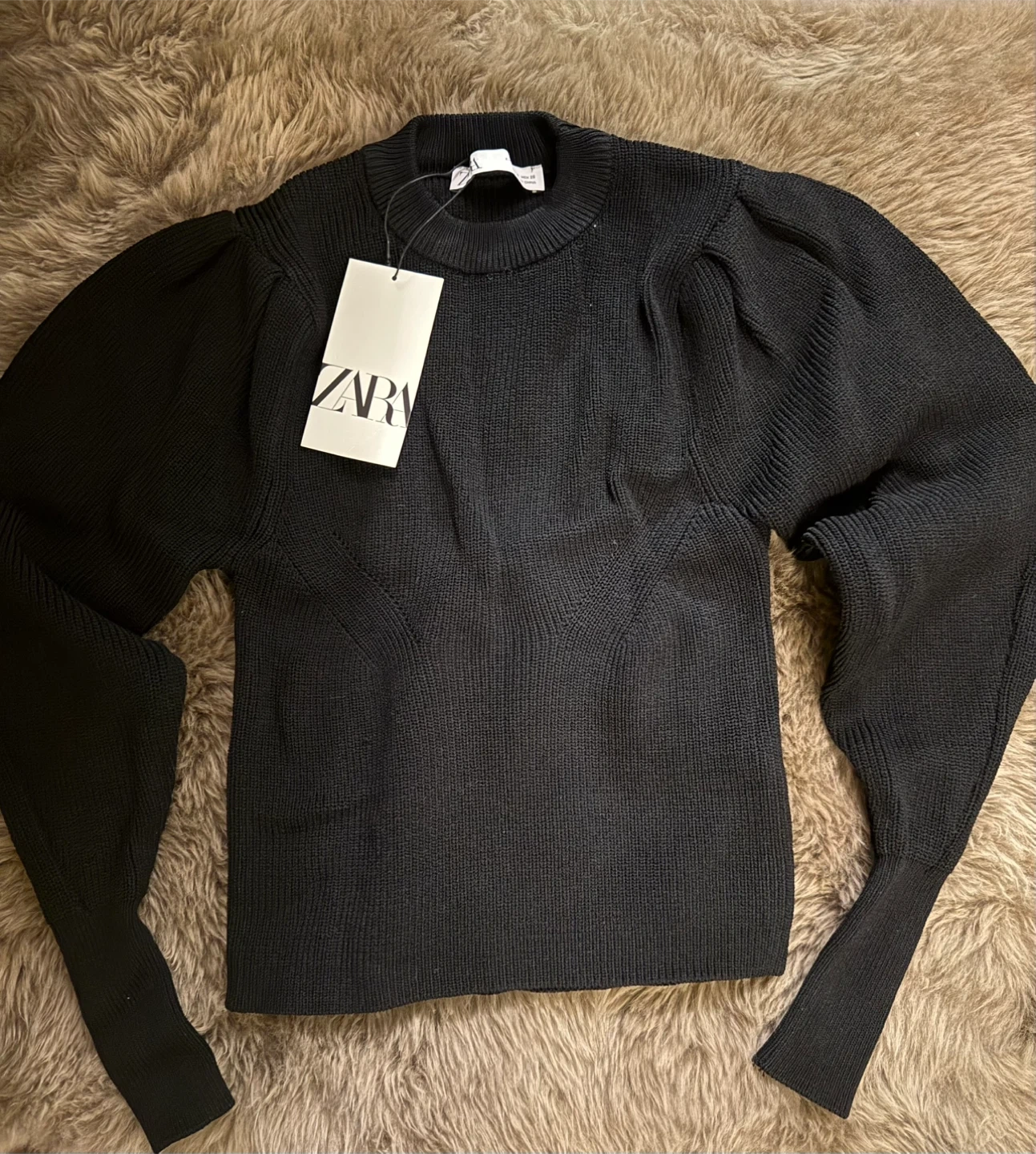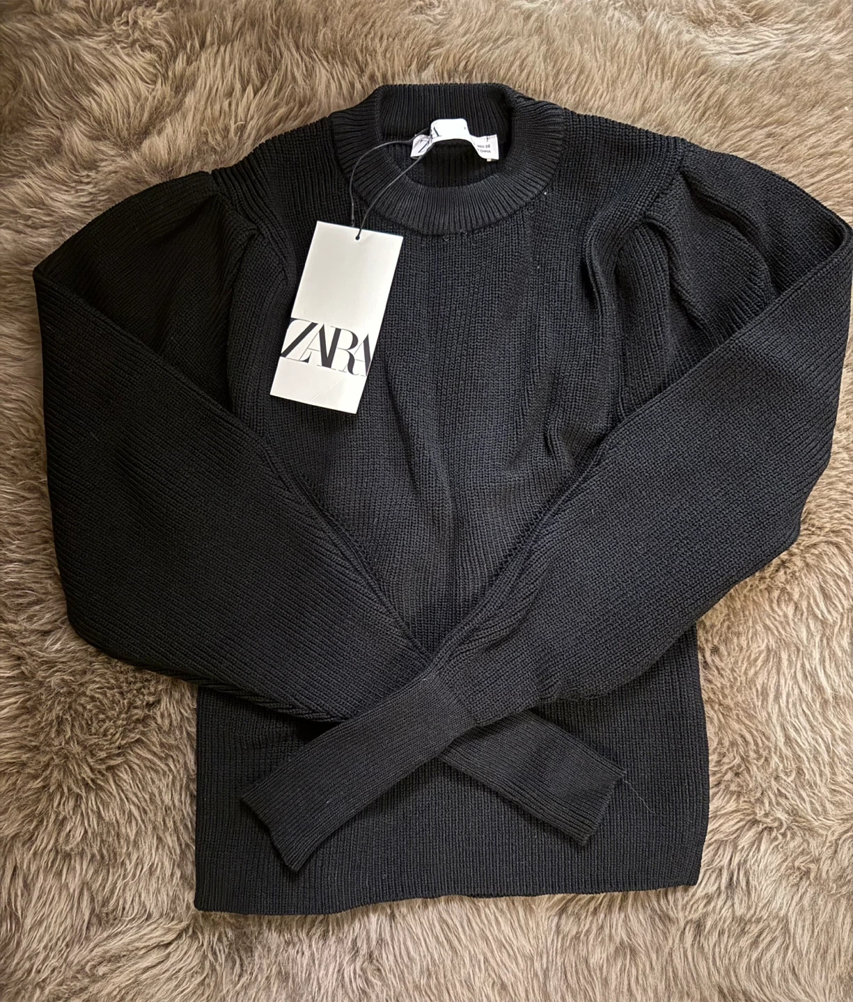 Selling a Zara black knit top! It features stylish puff sleeves . It's a versatile piece that can be dressed up or down. The material is soft and comfortable, perfect for the cooler weather. Brand new Size S