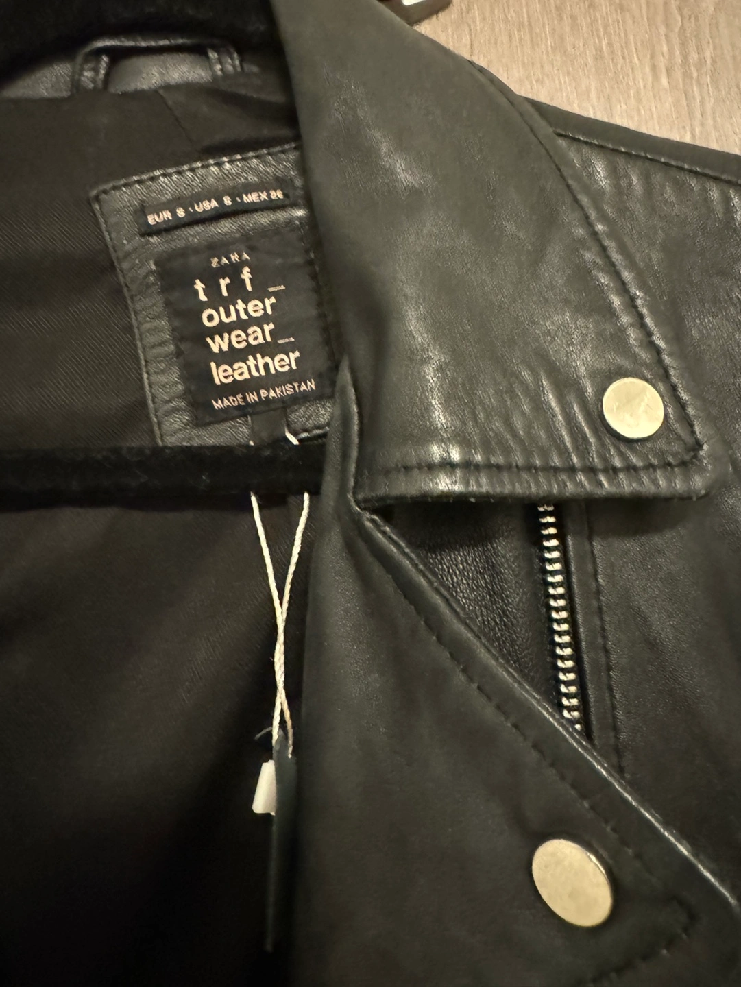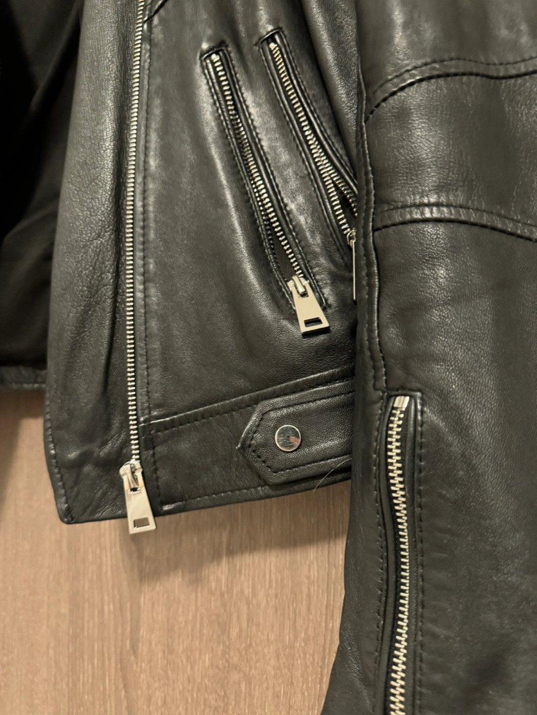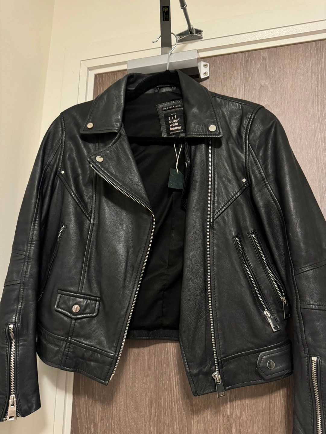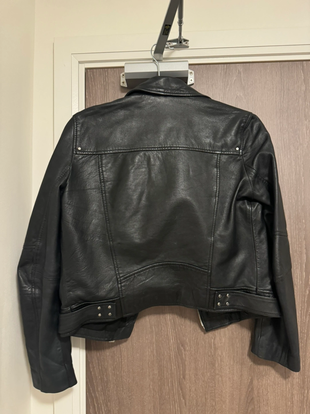 172Black leather jacket. Size S. Features a zipper closure, two zipper pockets on the front, and two zipper pockets on the inside. It has a belt at the waist.