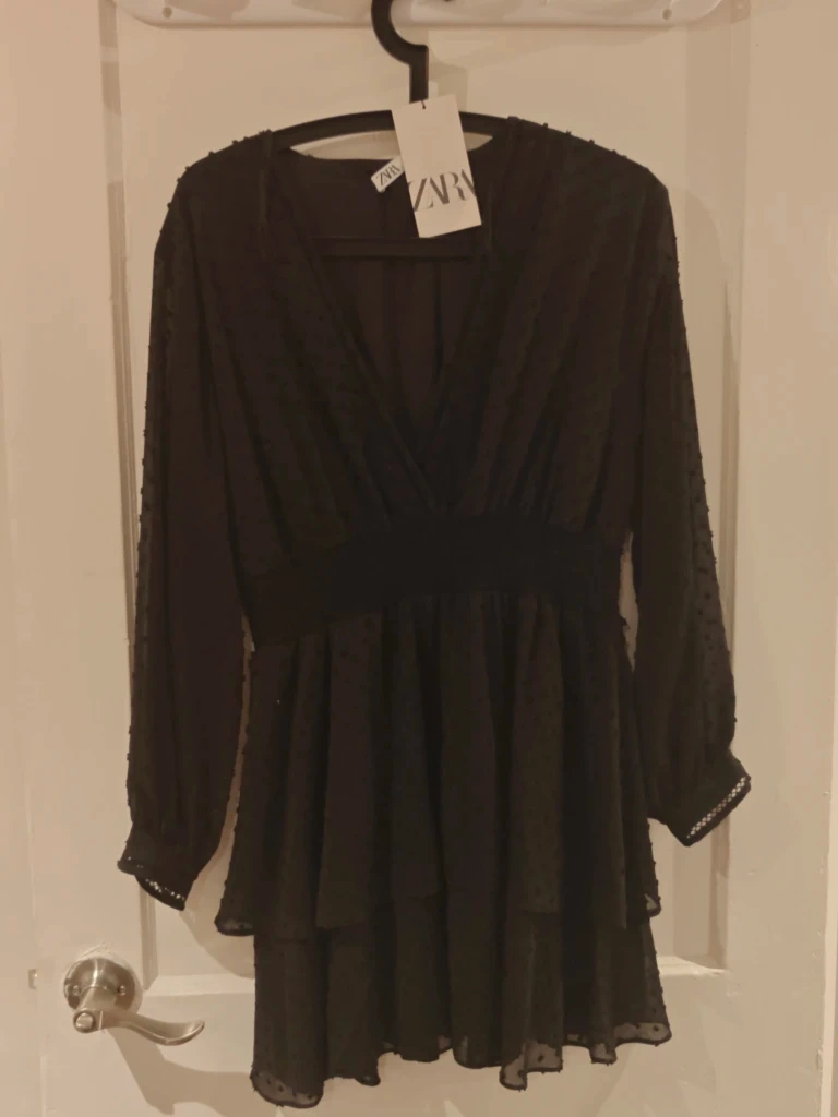 93Selling a cute Zara black mini dress in size M. It has long sleeves and a tiered skirt. Perfect for a night out or a special occasion!
