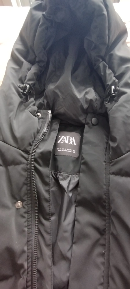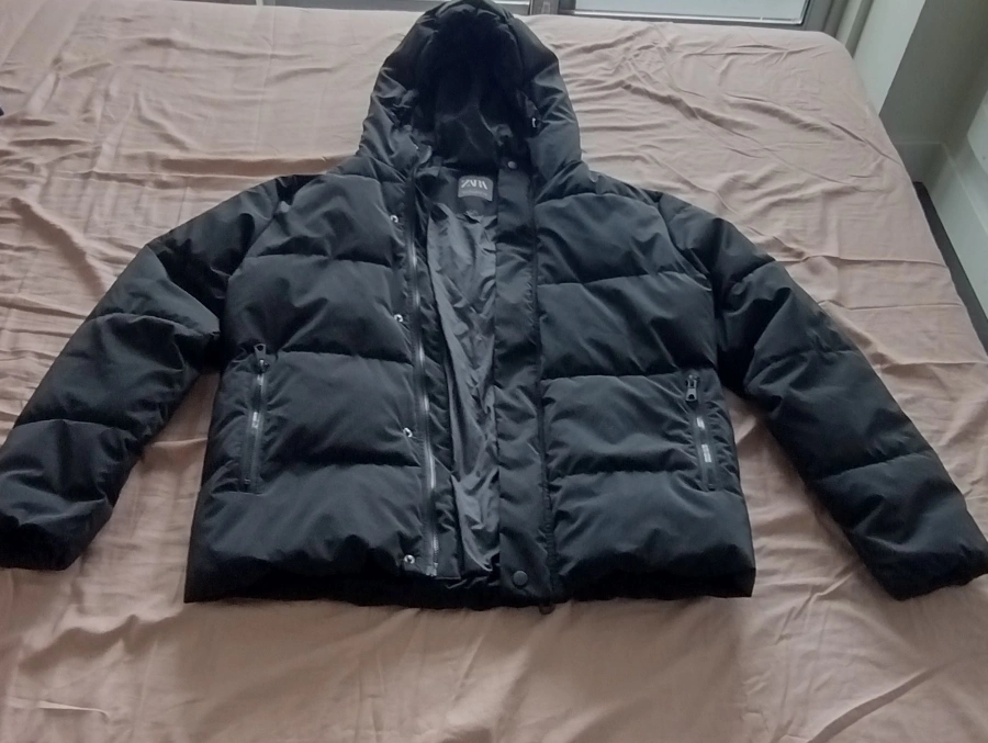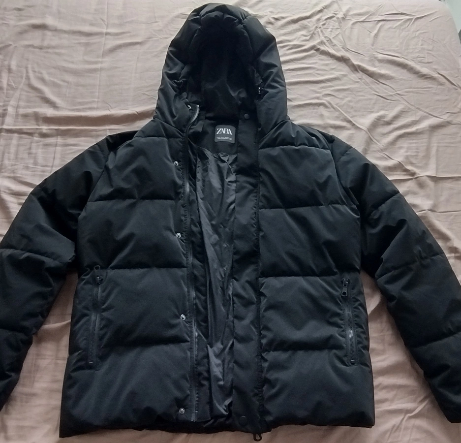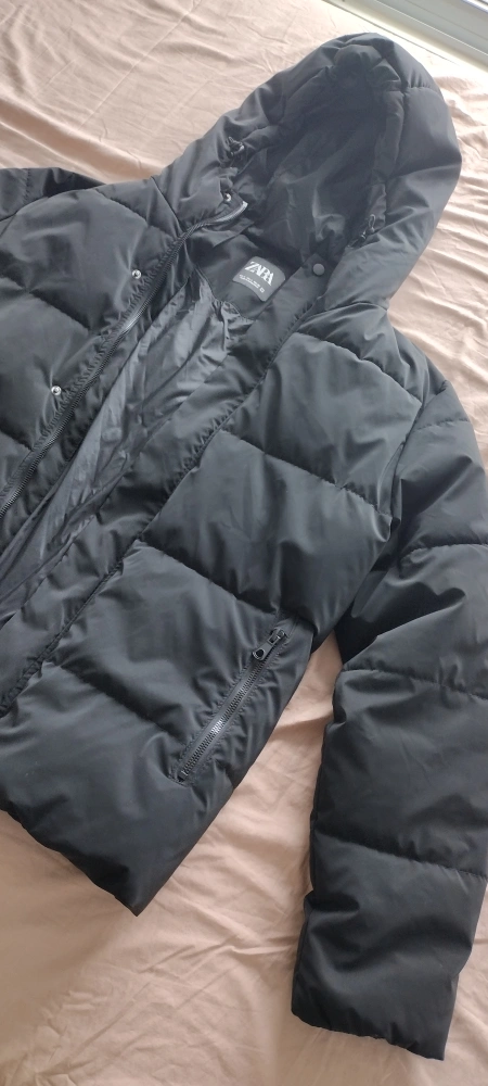 203Zara black puffer jacket. Features a hood and zipper closure. Side pockets with zippers. Excellent for cold weather.