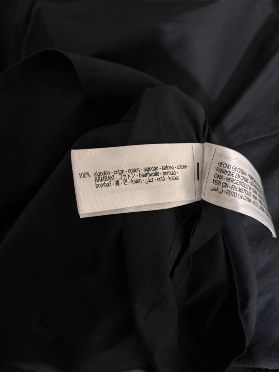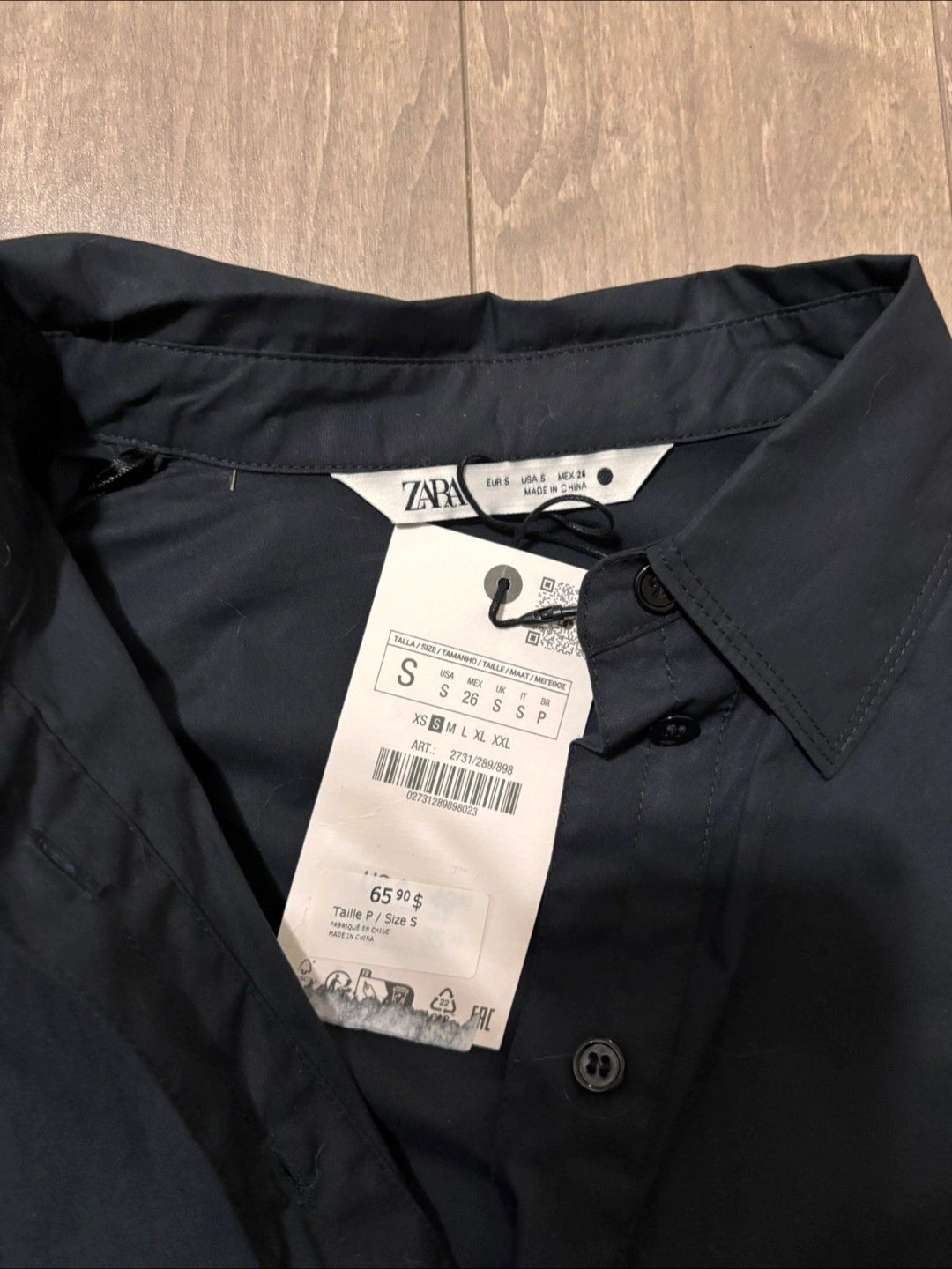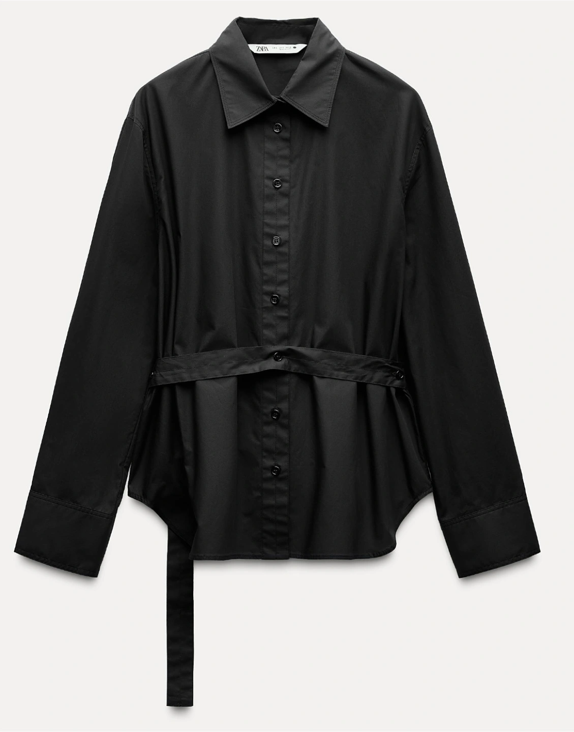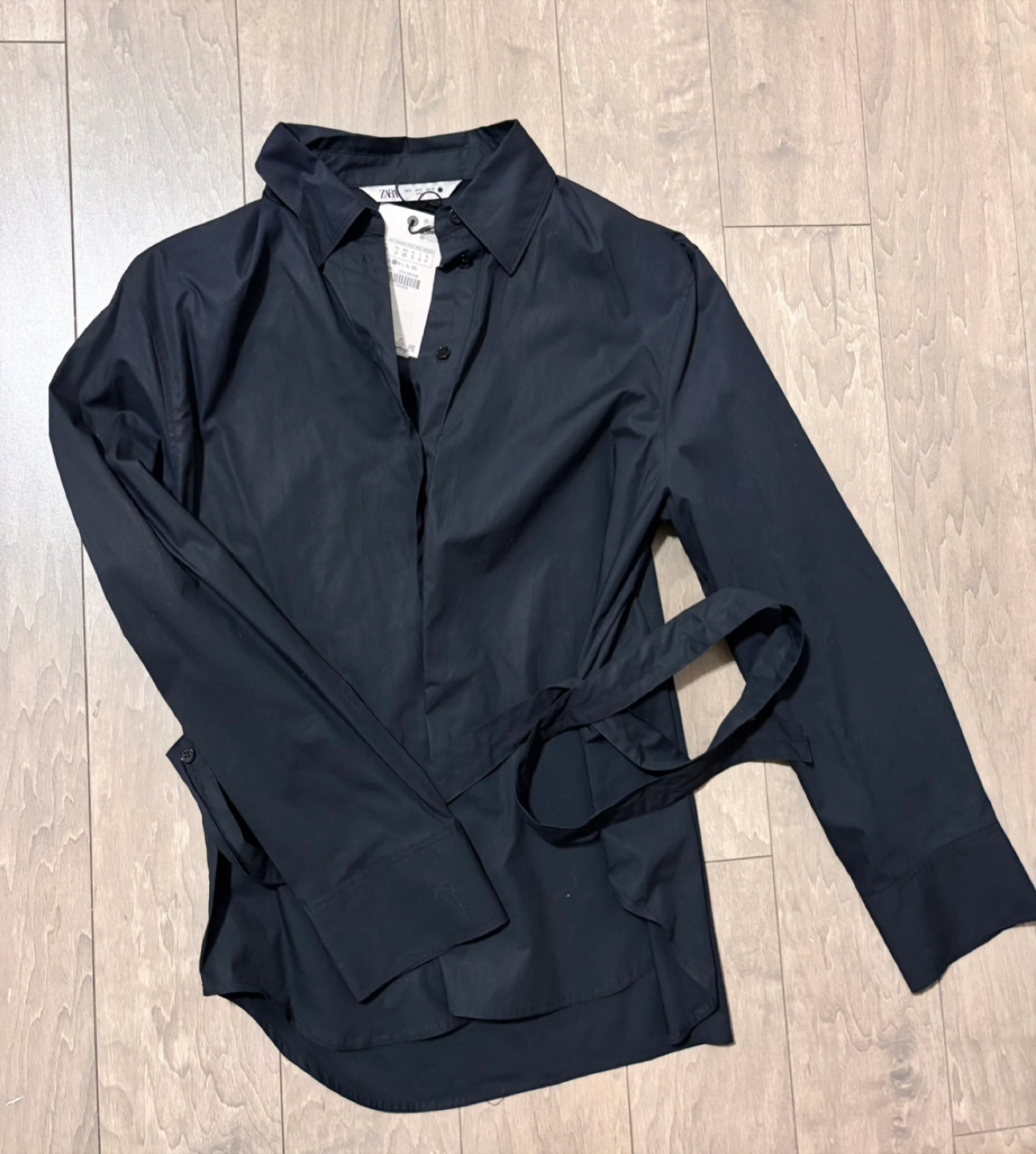 A stylish black tie-front shirt from Zara in size small. This shirt is made of 100% cotton.