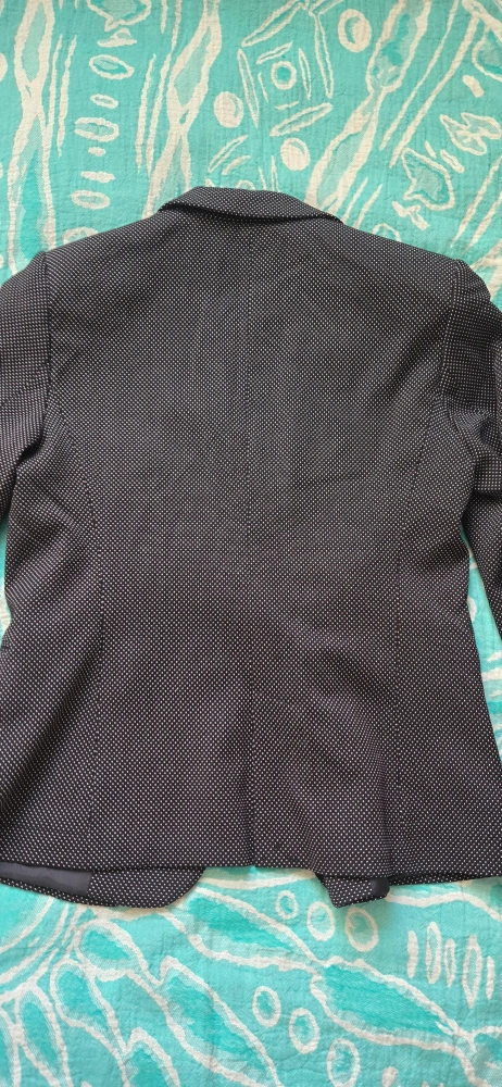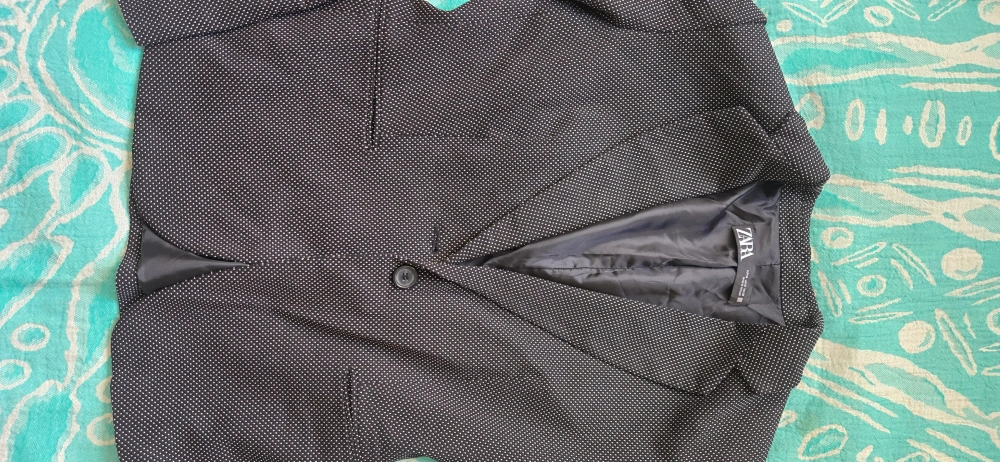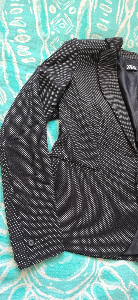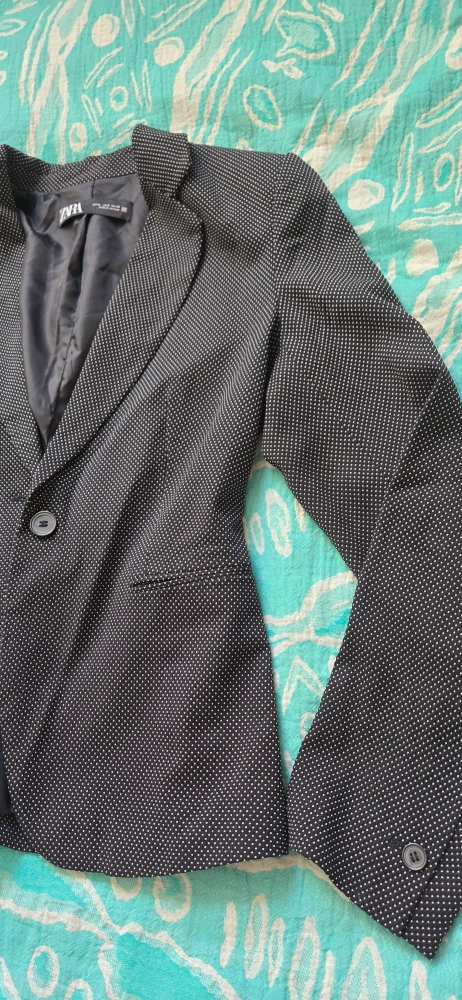Here's a stylish Zara blazer in a classic black and white polka dot pattern! It's perfect for adding a touch of sophistication to any outfit. It's in great condition and ready for a new home!