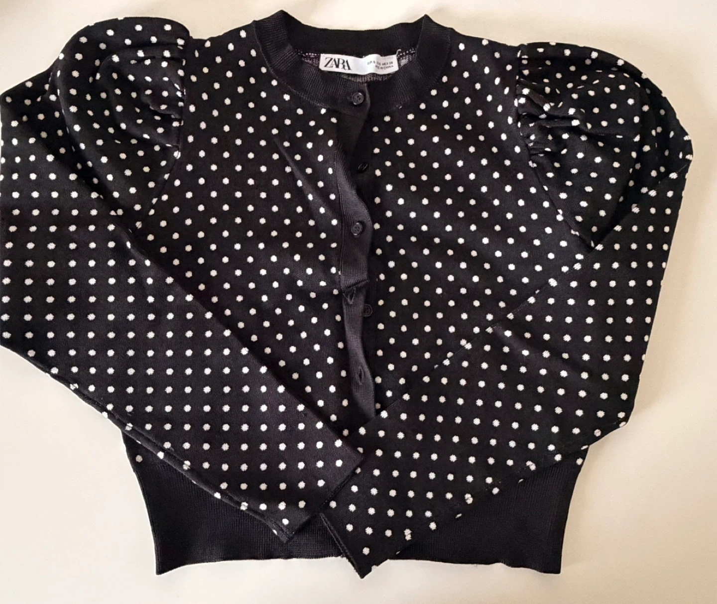 This is a Zara cardigan with a cute polka dot pattern! It's black with white dots and has a puff sleeve detail. It's a size S
