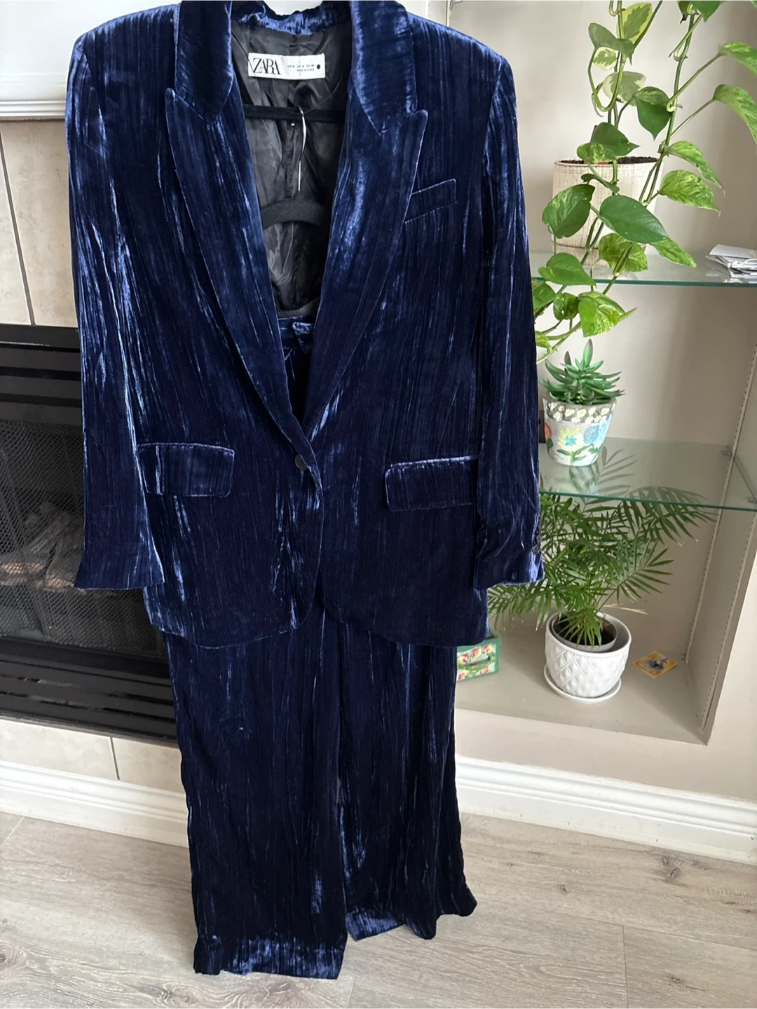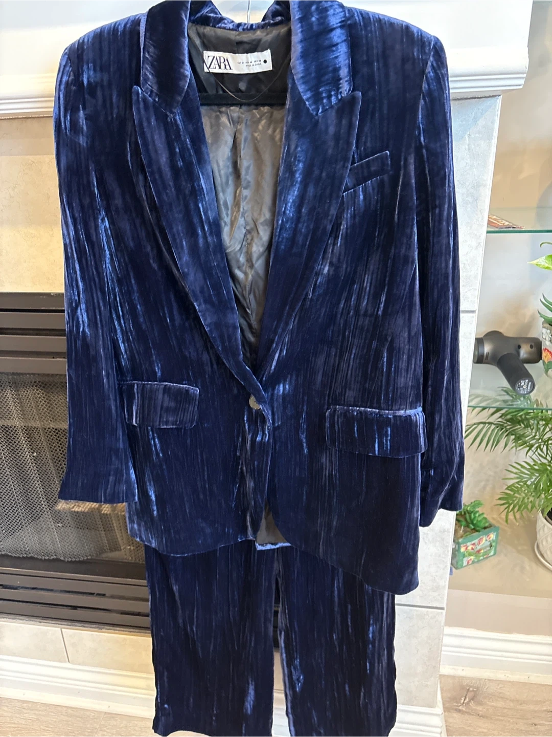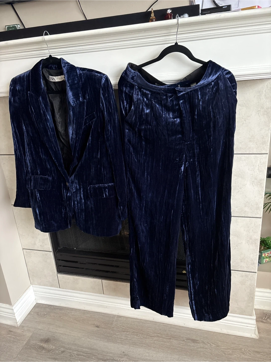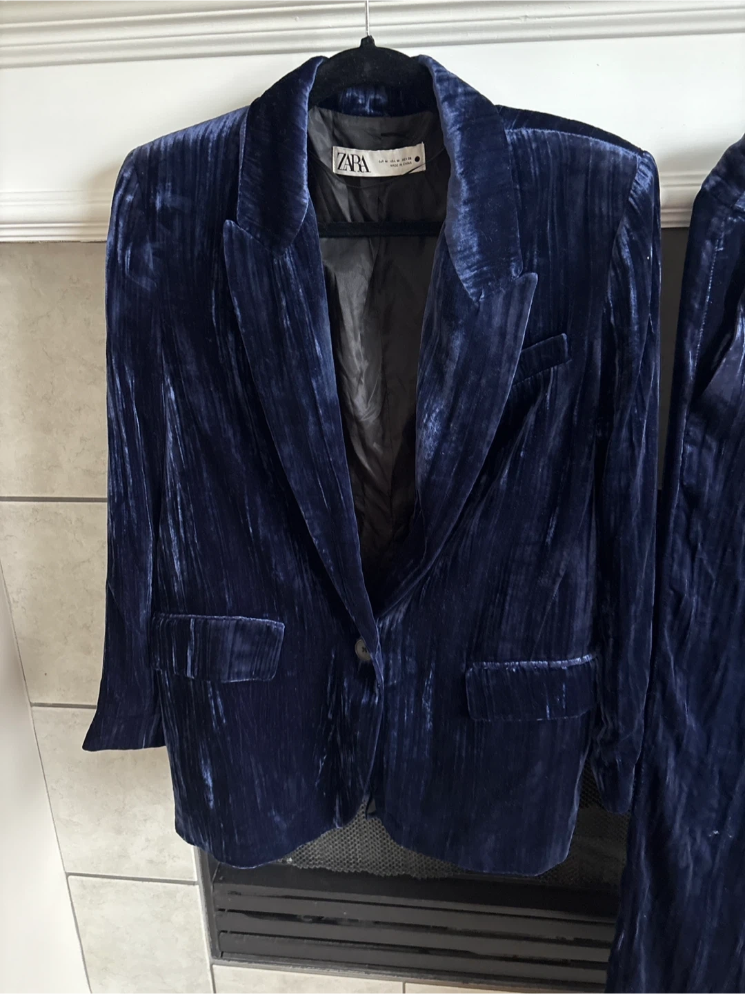 17Selling a stylish Zara blue velvet suit, including both the blazer and pants. The blazer is size M and the pants are size L. This suit is in great condition and perfect for a night out or special occasion!