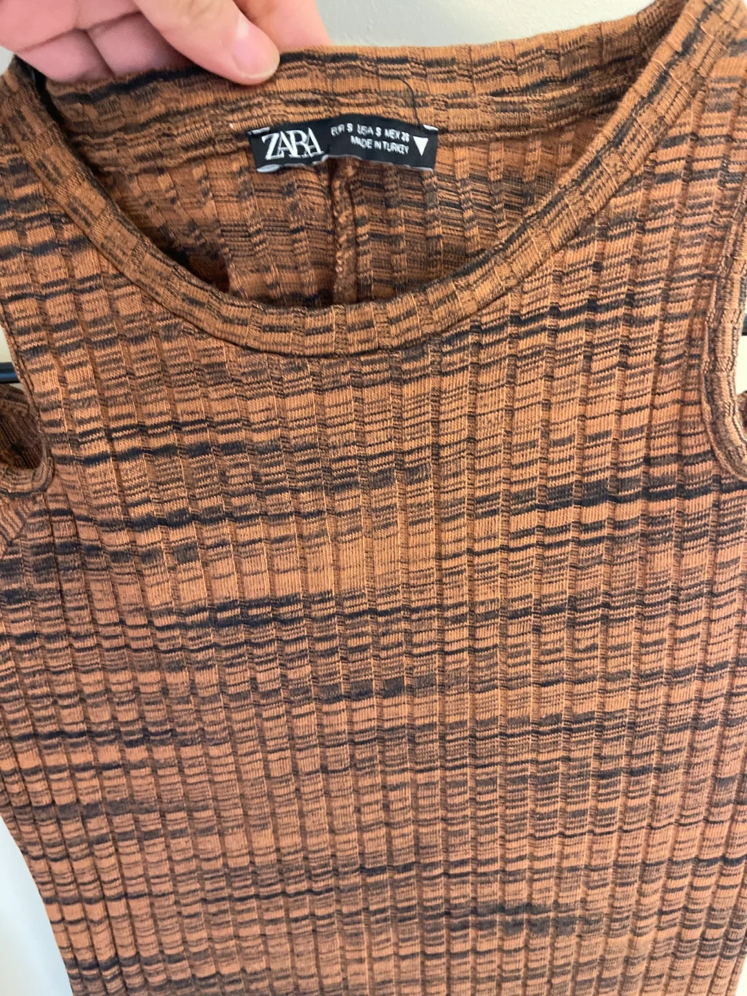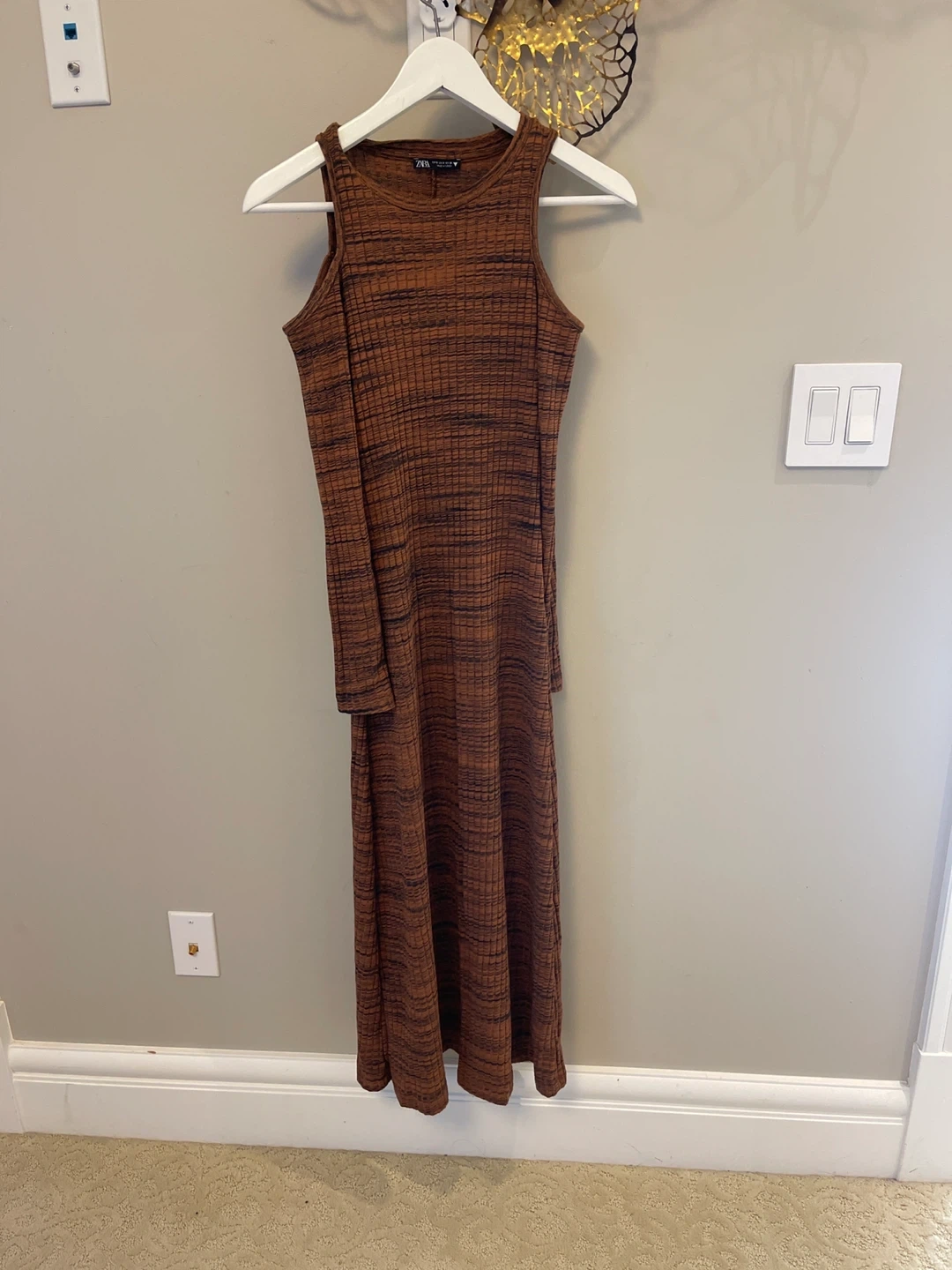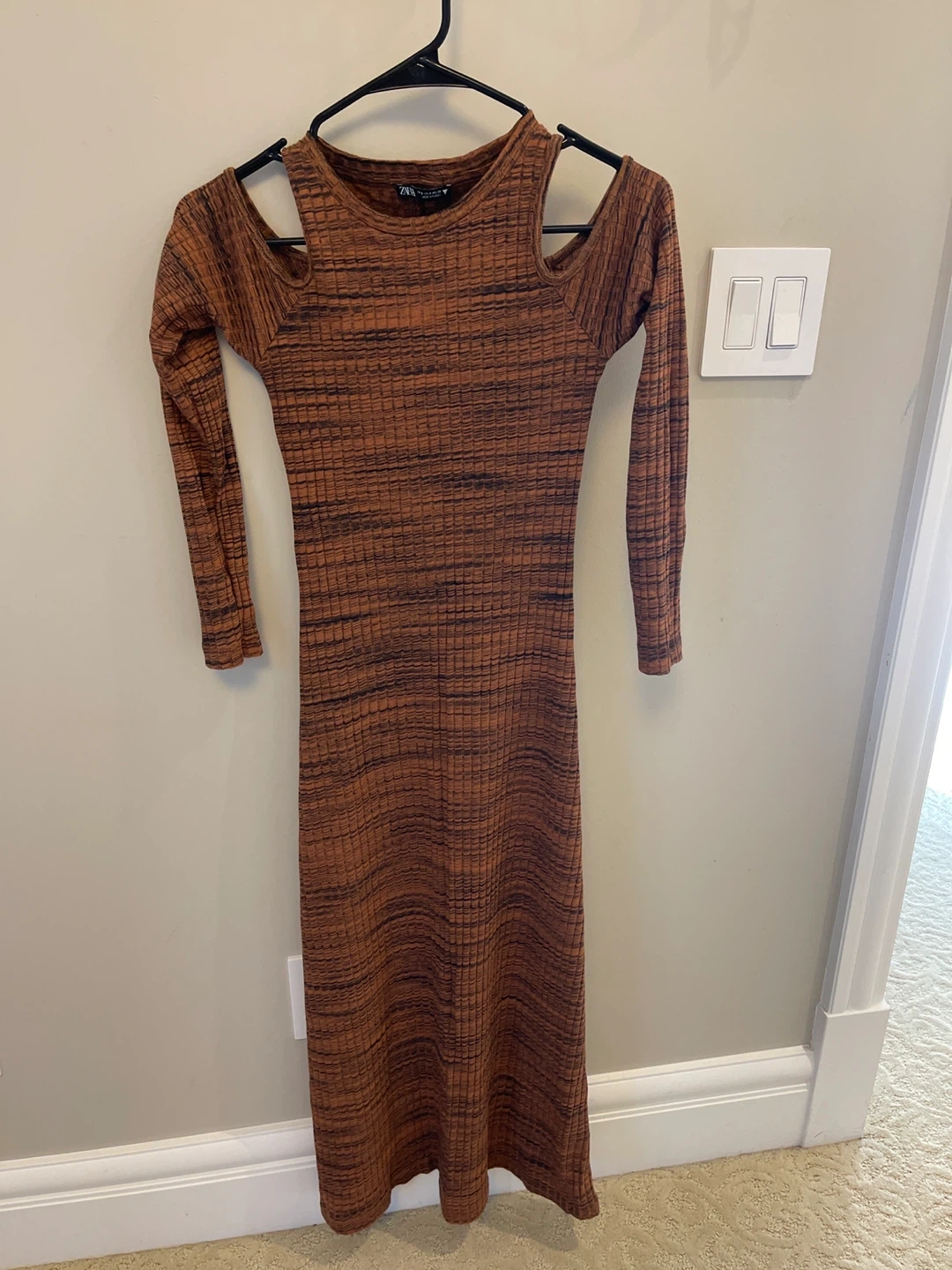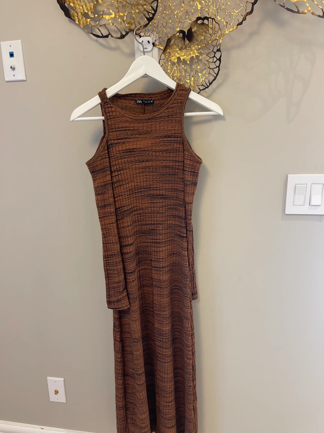25Selling a Zara knit midi dress in size small! It features a unique brown and black striped pattern. It's in great condition and ready for a new home