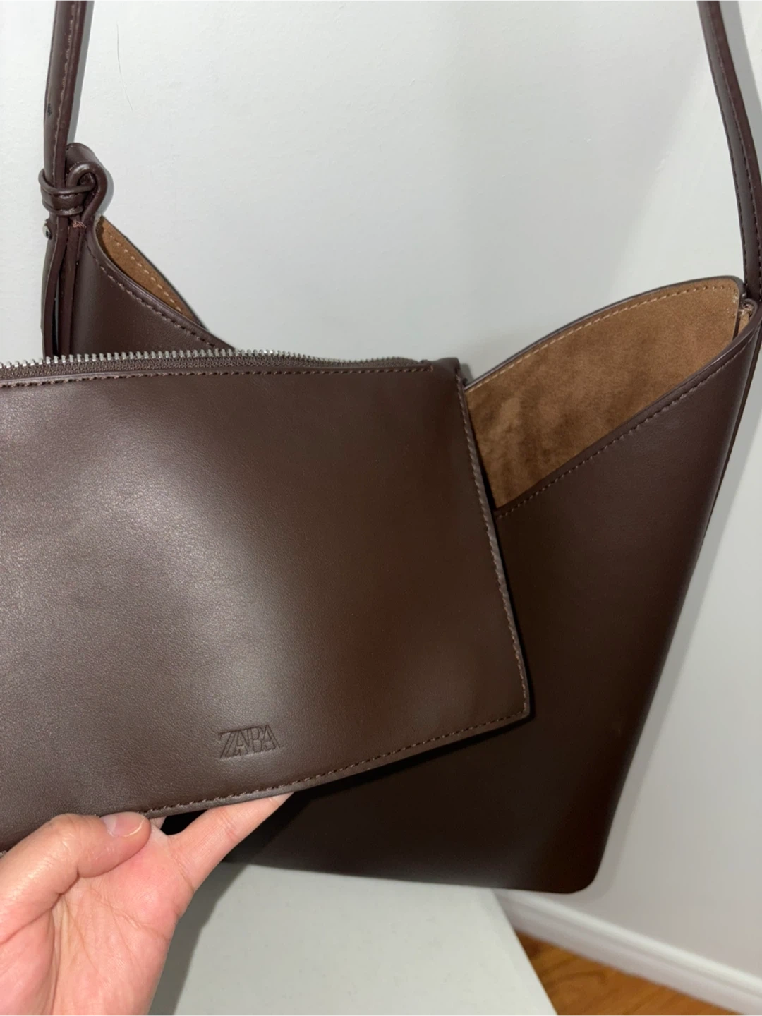 62Selling a lovely Zara brown tote bag! It comes with a matching pouch, perfect for keeping your essentials organized. The bag is in great condition and ready for a new home!