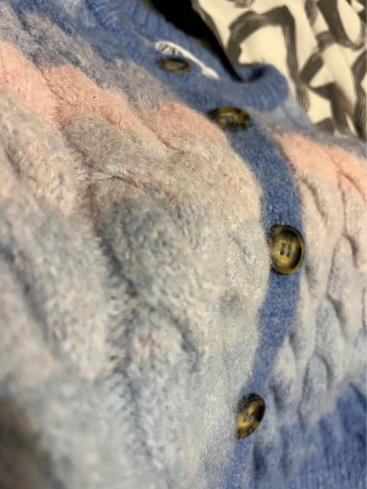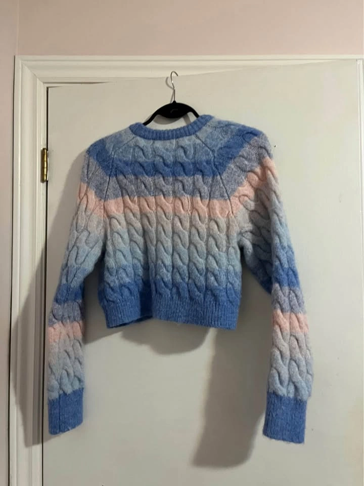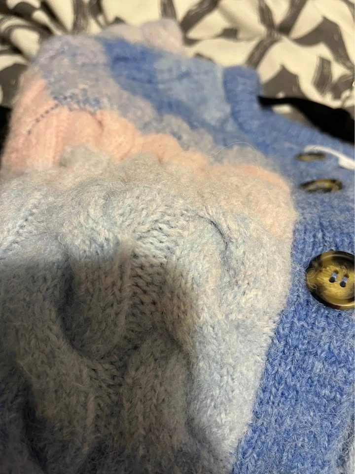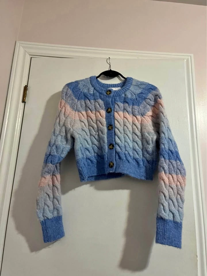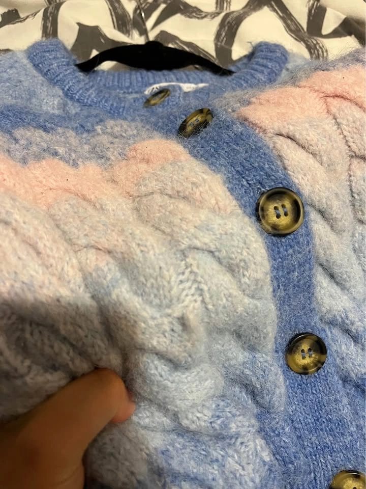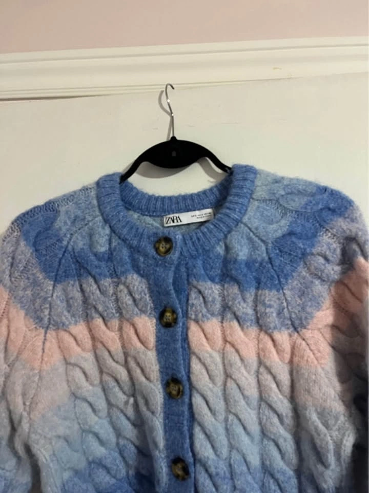 70Gently used chunky cardigan from Zara. Only one small flaw shown at the end of photos—there’s a thread coming out, maybe you can pull it back in or cut it out. Otherwise super cute!! From Zara. Size small. Can meet DT Toronto Or scarbs