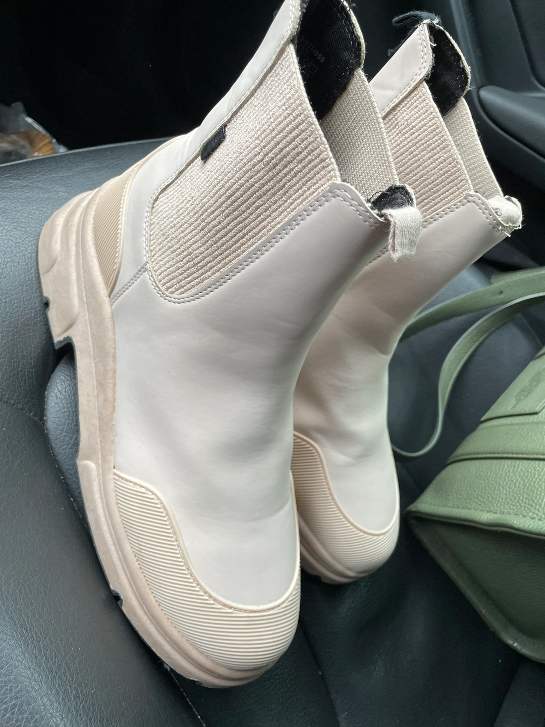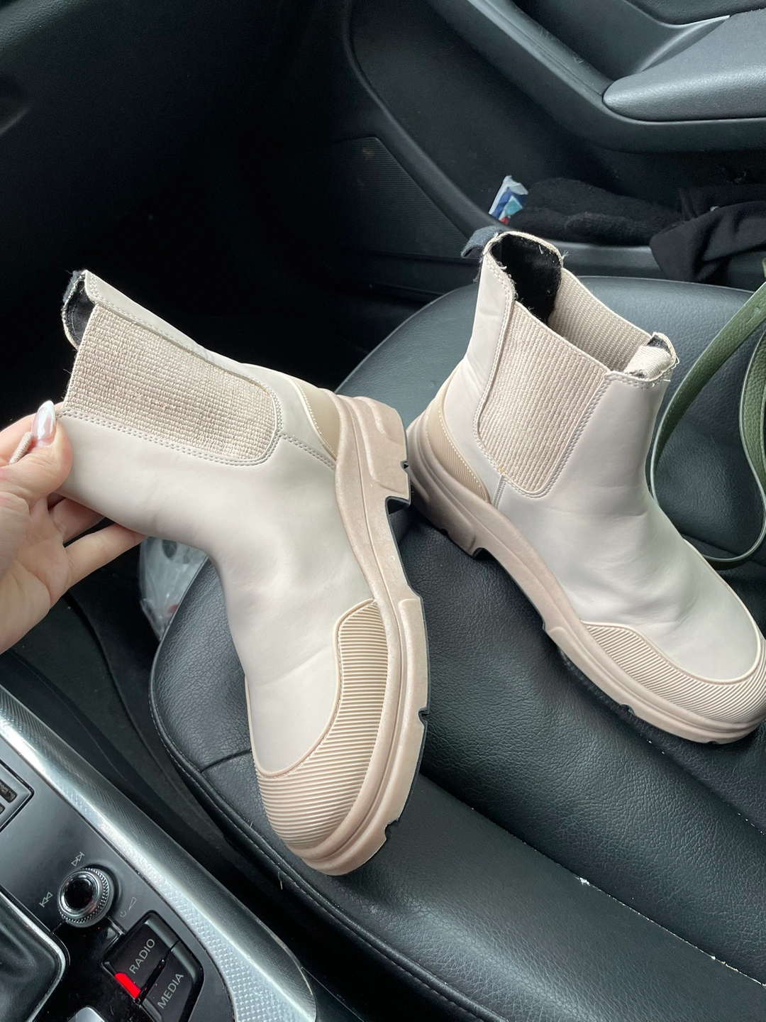These are cream ankle boots with a chunky sole. They are in good condition.