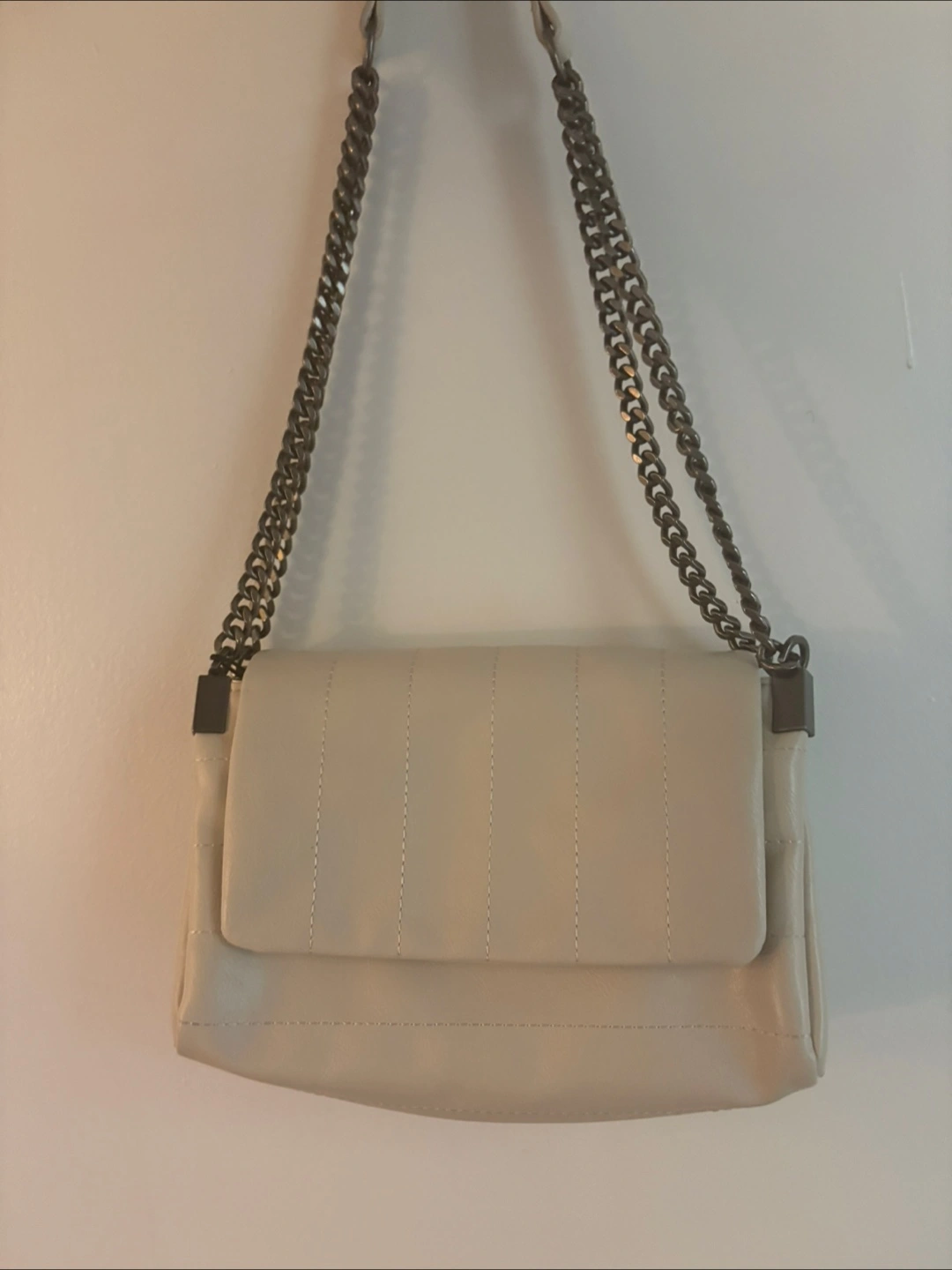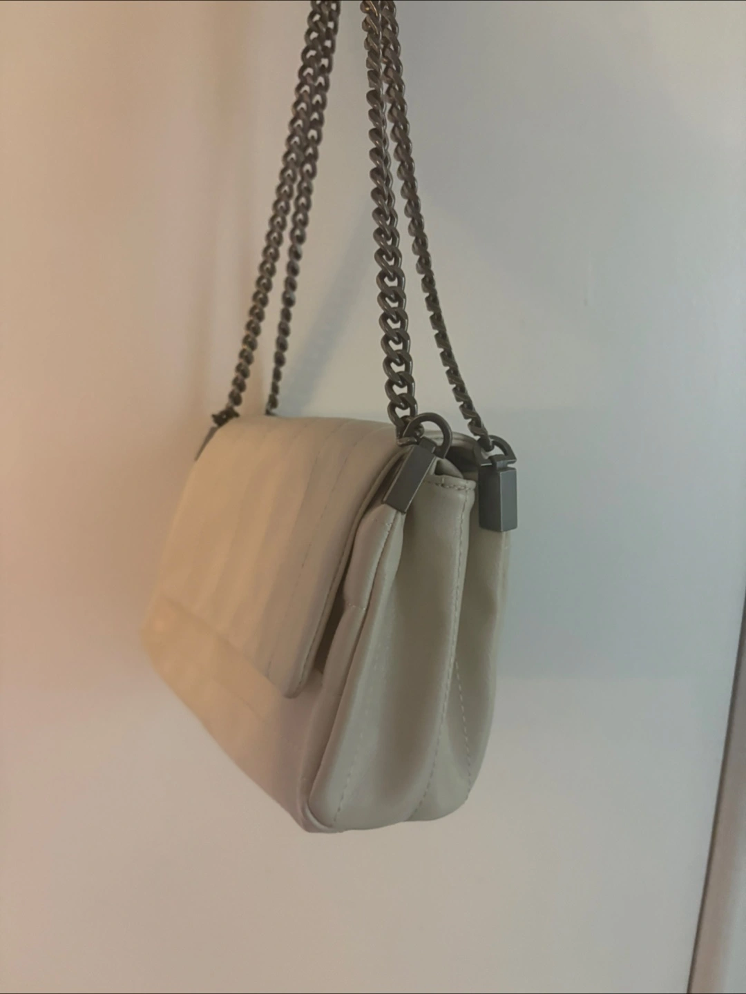 Selling a Zara cream quilted bag with a chain strap! It's in great condition and perfect for adding a touch of elegance to any outfit. The chain is a gunmetal colour.