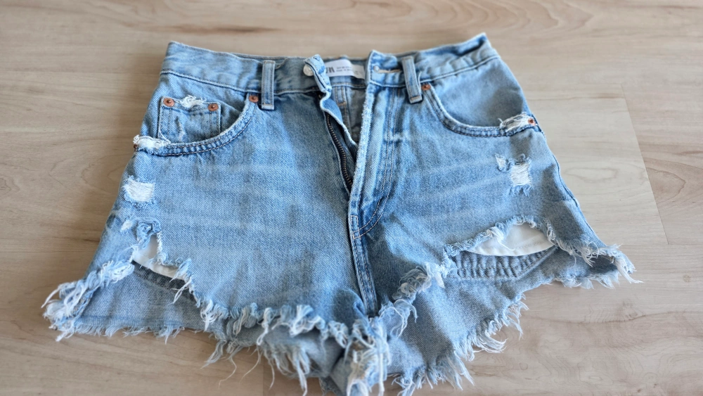Selling a pair of Zara denim shorts in a light wash. They are size 0 (USA) / 32 (EUR). These shorts have a stylish, distressed look with frayed edges. Perfect for a casual summer outfit! ✨ Brand: ZARA ✨ Size: EUR 32 / US 0 / MEX 22 ✨ Light blue denim, distressed design with raw hem ✨ High-waisted, trendy and comfortable ✨ Great condition