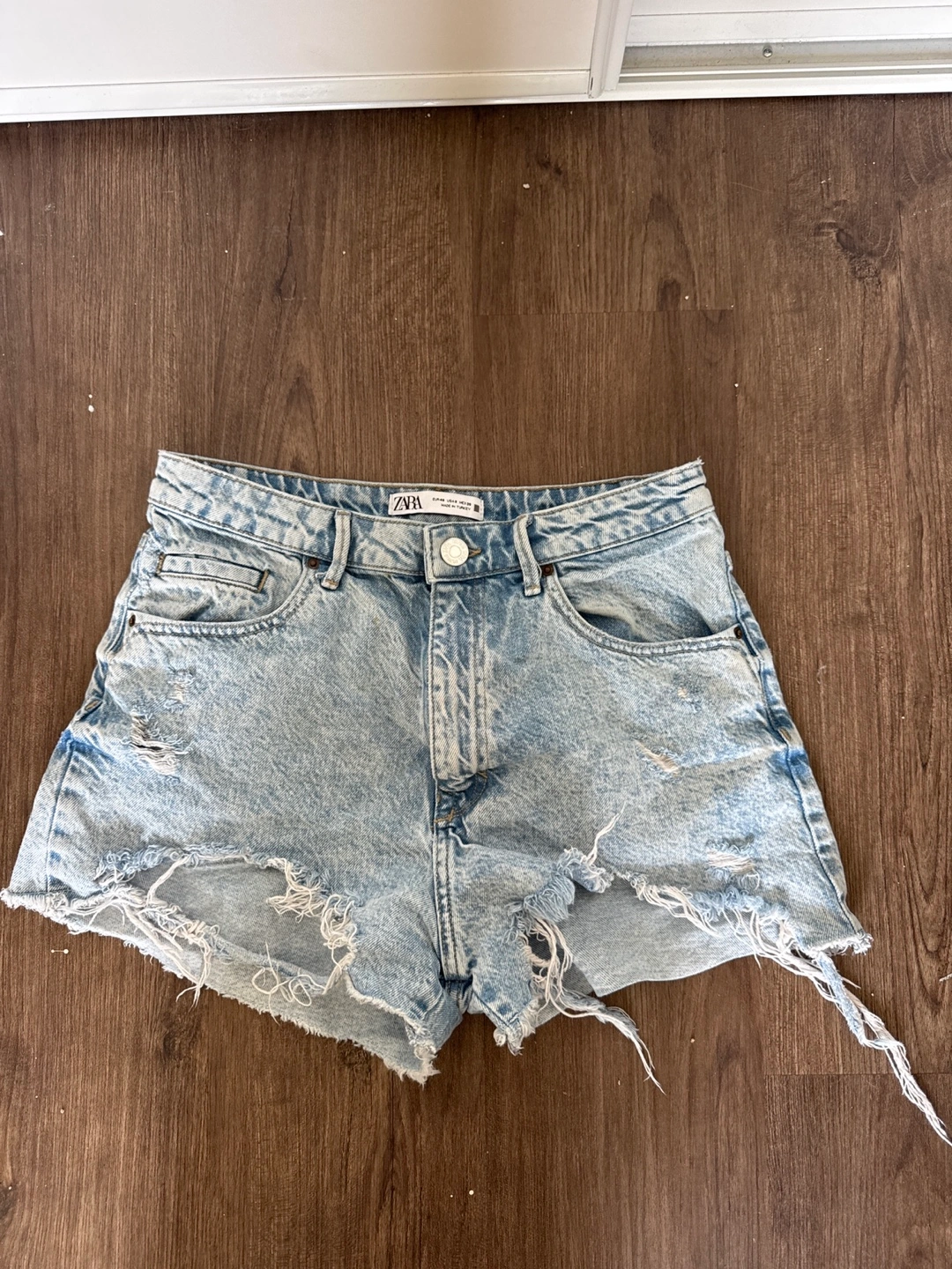 Selling a pair of Zara denim shorts. They are a light wash with a distressed, frayed hem. Perfect for summer!