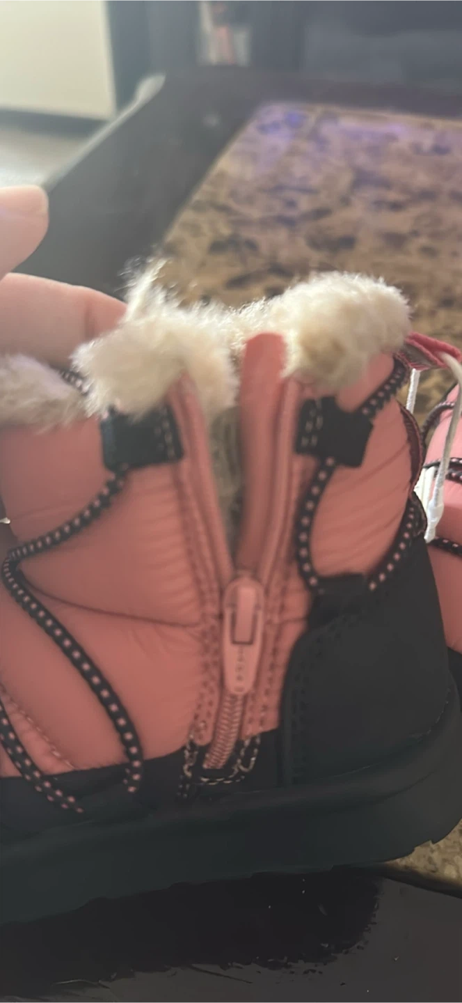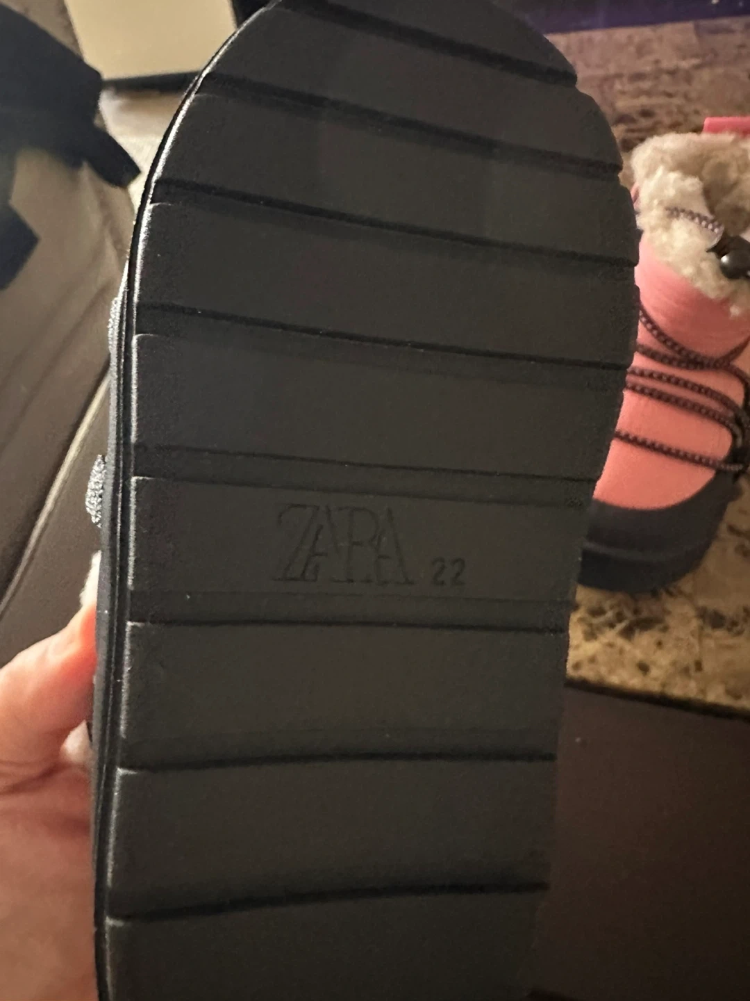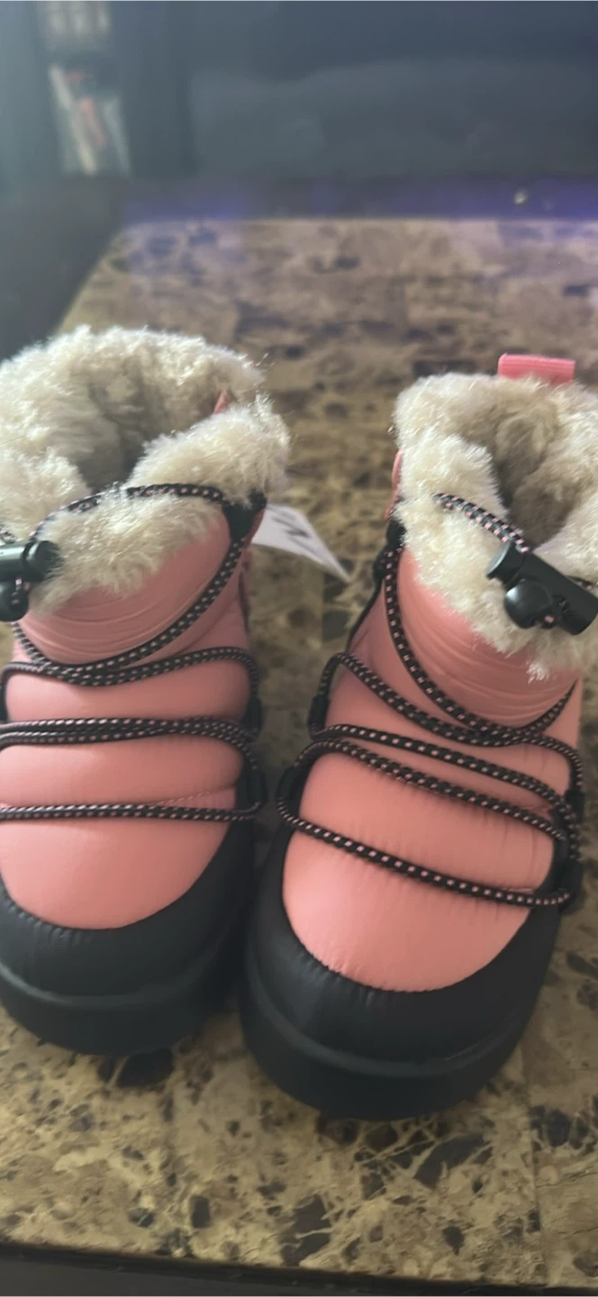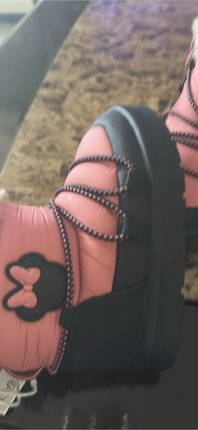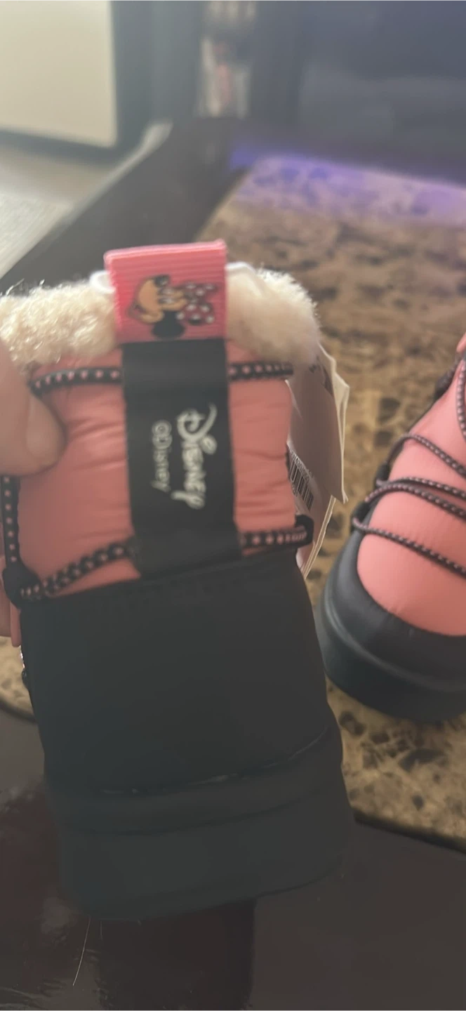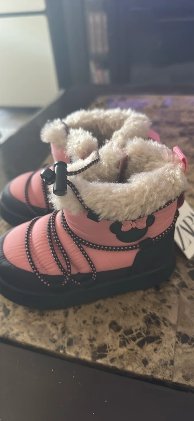 These adorable Disney winter Zara boots are perfect for your little one! They are brand new with tags. They feature a cute Minnie Mouse design and are in a toddler size 6.5 The boots are pink with black accents and have a cozy faux fur lining to keep your child's feet warm all winter long